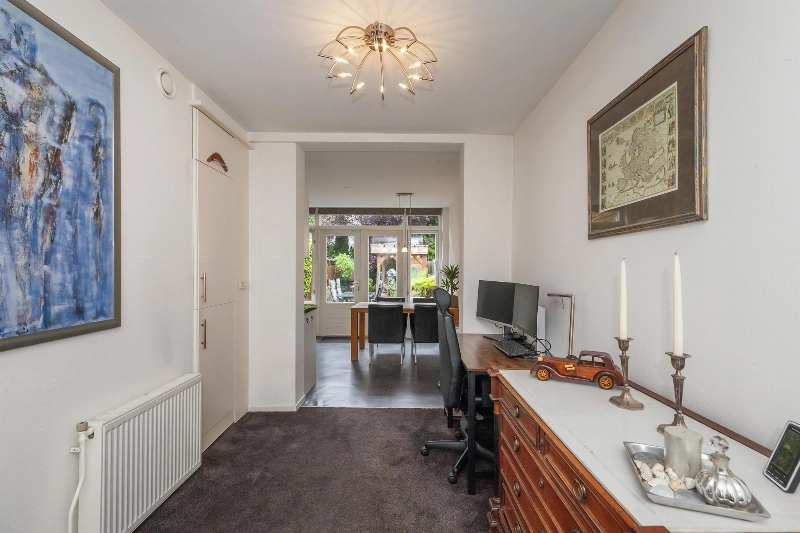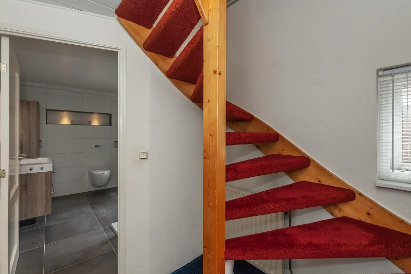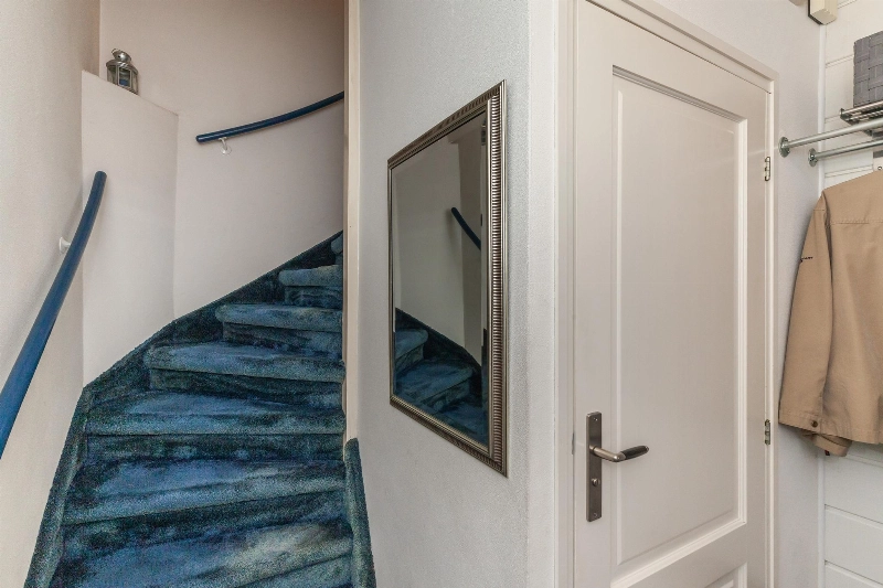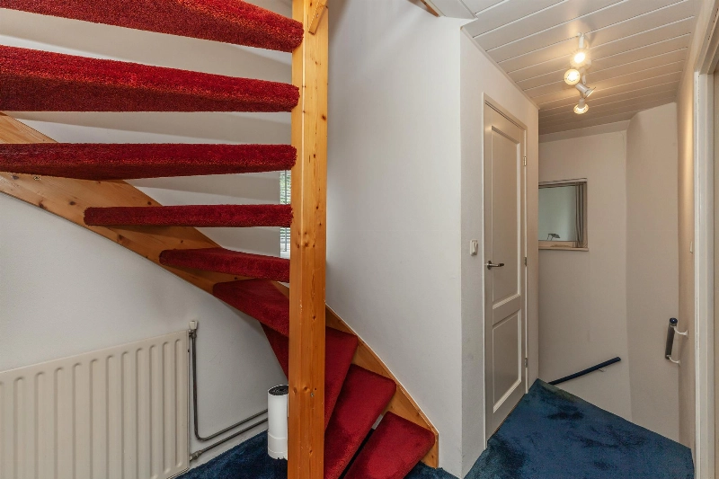 In de doorgang naar de woonkeuken is een grote vaste kast onder de trap naar de bovenverdieping. Hier vindt u ook de meterkast.