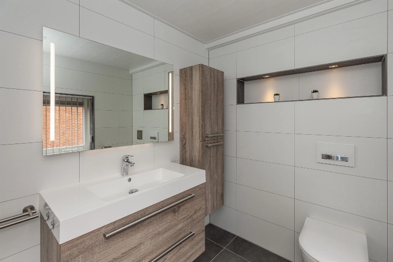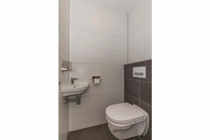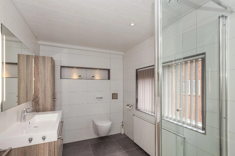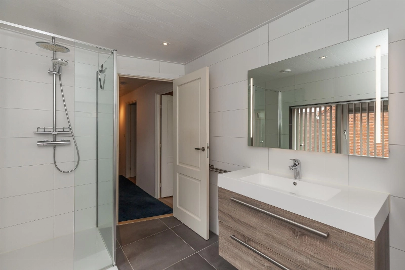 De moderne badkamer is in 2019 nieuw geplaatst en is geheel wit/grijs betegeld. Deze ruime badkamer is voorzien van een inloopdouche, een wastafelmeubel met zwevende kast en een verlichte spiegel, een 2e toilet met handig ingebouwde ruimte voor de toiletrollen. Deze ruimte is voorzien van een raam, zodat er natuurlijk licht aanwezig is. Tevens is er mechanische ventilatie met vochtsensor.