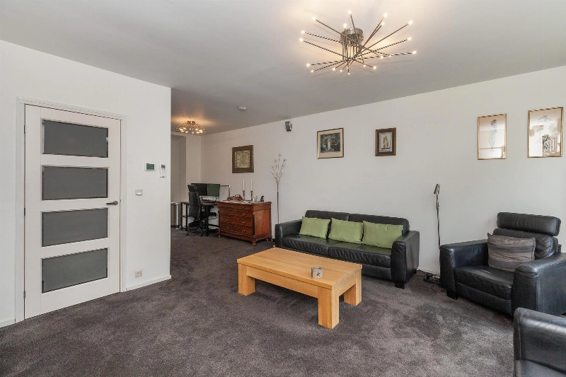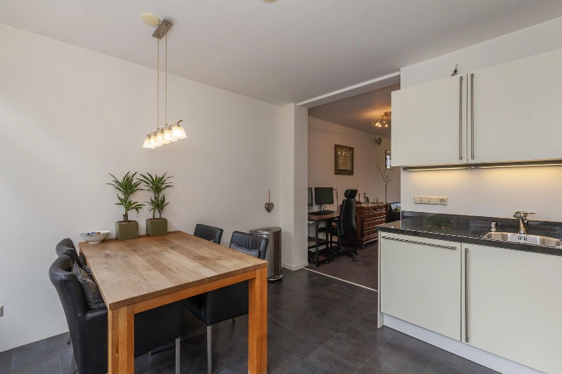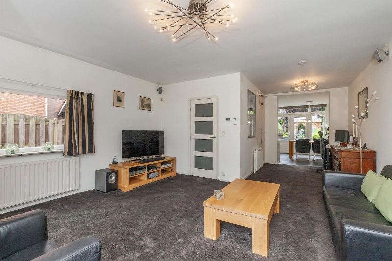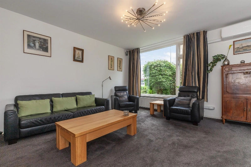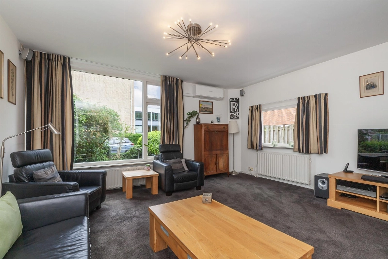 De ruime en gezellige woonkamer heeft de zithoek aan de voorzijde van de woning en is voorzien van airco. De grote ramen zorgen voor veel lichtinval en geven ook nog eens een leuk zicht op de voortuin en straat.
