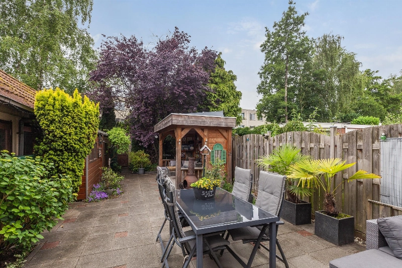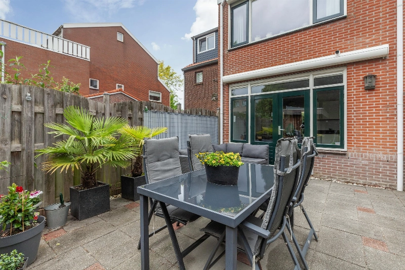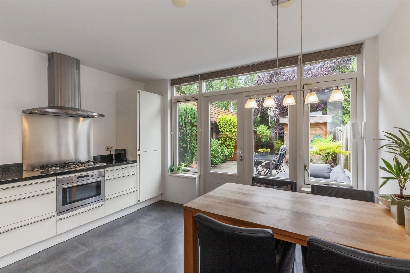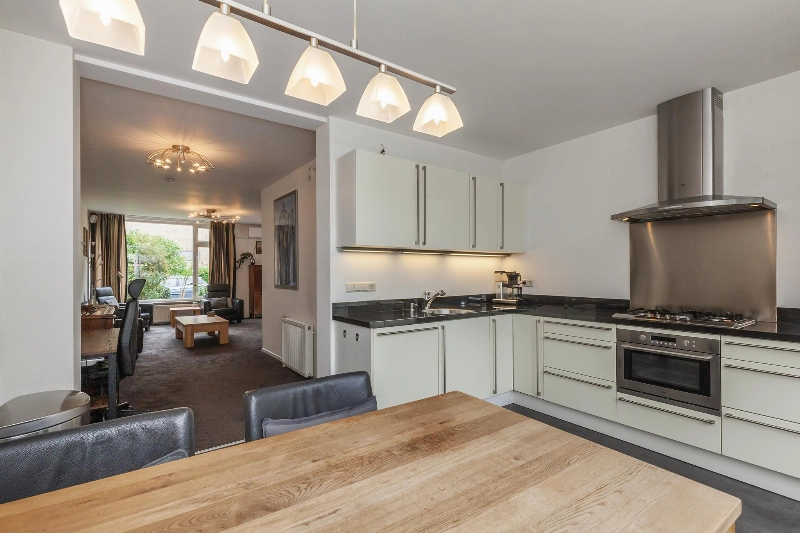 De woonkeuken heeft dankzij de grote pui met dubbele deuren veel natuurlijk lichtinval en geeft direct toegang tot de heerlijke achtertuin. Hier is een elektrisch zonnescherm aanwezig. Er is een strakke hoekopstelling met hardstenen blad en diverse inbouwapparatuur zoals koelkast, vriezer, afzuigkap, 5 pits gaskookplaat, vaatwasser, combimagnetron oven en een close-in boiler. Via de openslaande deuren bereikt u de achtertuin. En wat een tuin is dit!