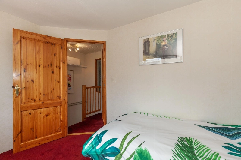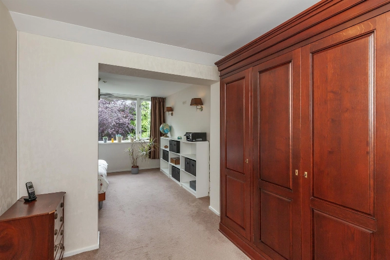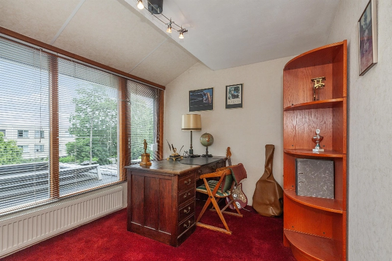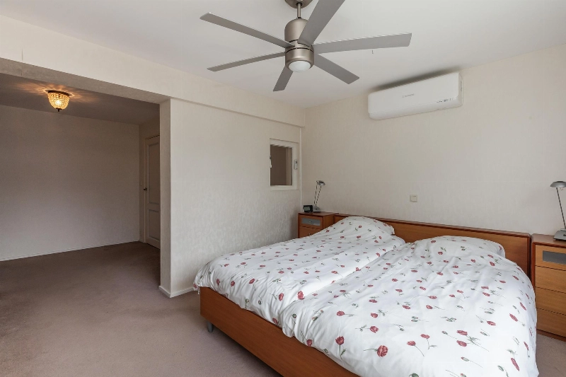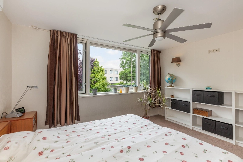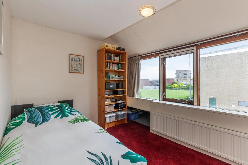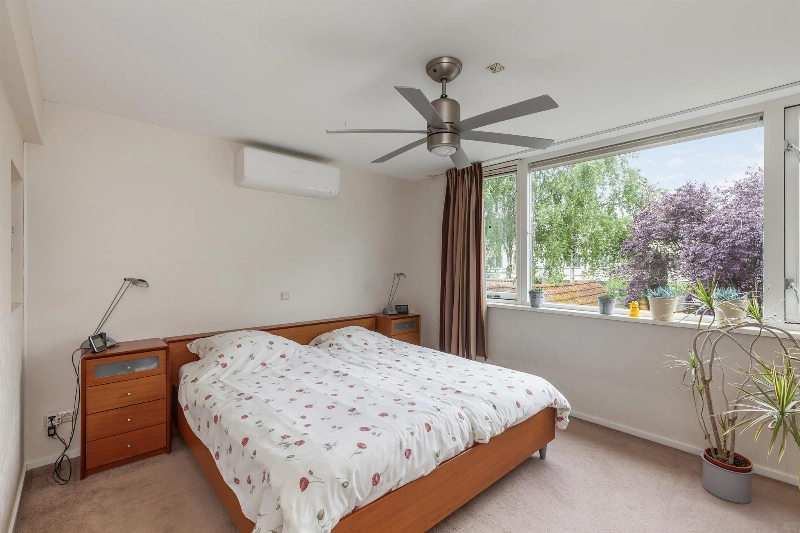 Aan de achterzijde van de woning is de 2e slaapkamer. Deze kamer heeft door de uitbouw aan de achterzijde een prachtige afmeting en kan ingericht worden als kleedkamer met royale slaapkamer! Deze kamer is voorzien van een airco, een elektrisch rolluik en een hor.