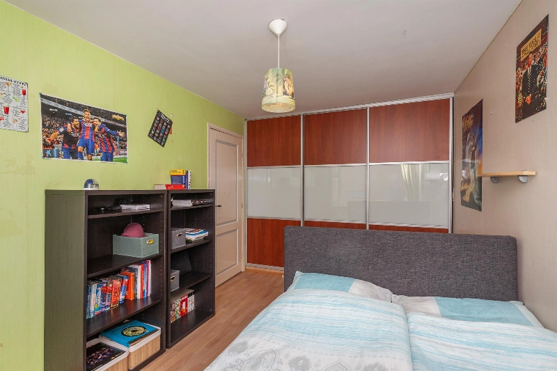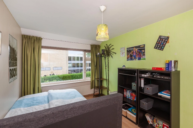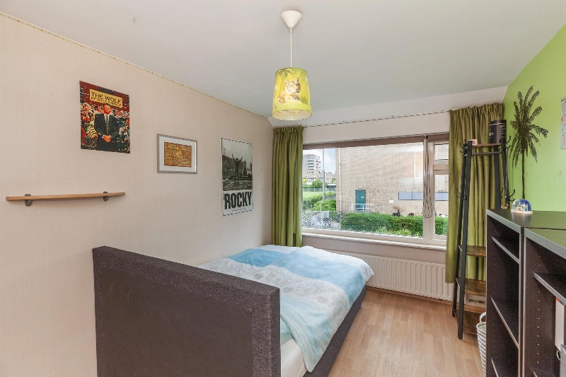 Aan de voorzijde van de woning bevindt zich een grote slaapkamer met schuifkast en het openslaande raam is voorzien van een hor.