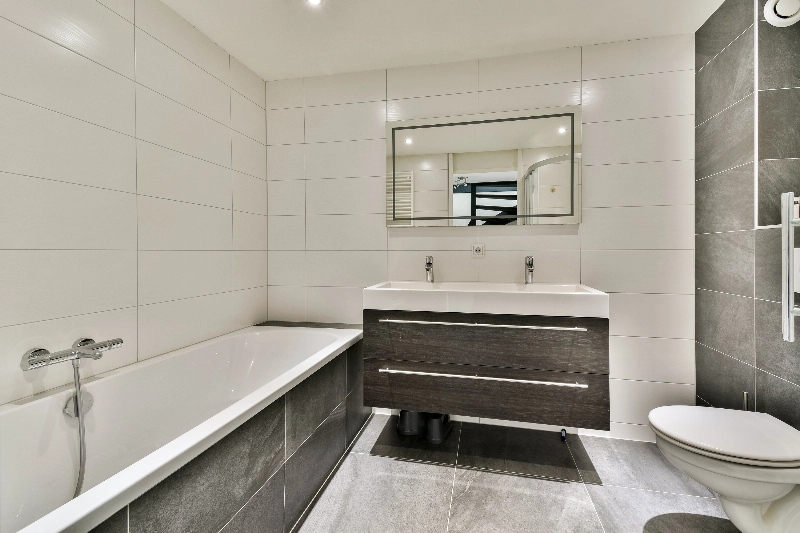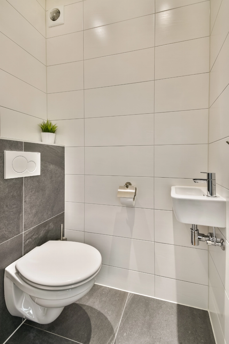 De moderne badkamer is stijlvol uitgevoerd in witte wand- en grijze vloertegels en compleet uitgerust met een ligbad, douchecabine, 2e toilet, breed wastafelmeubel, mechanische ventilatie en een elektrische vloerverwarming, dat is nog eens genieten.
