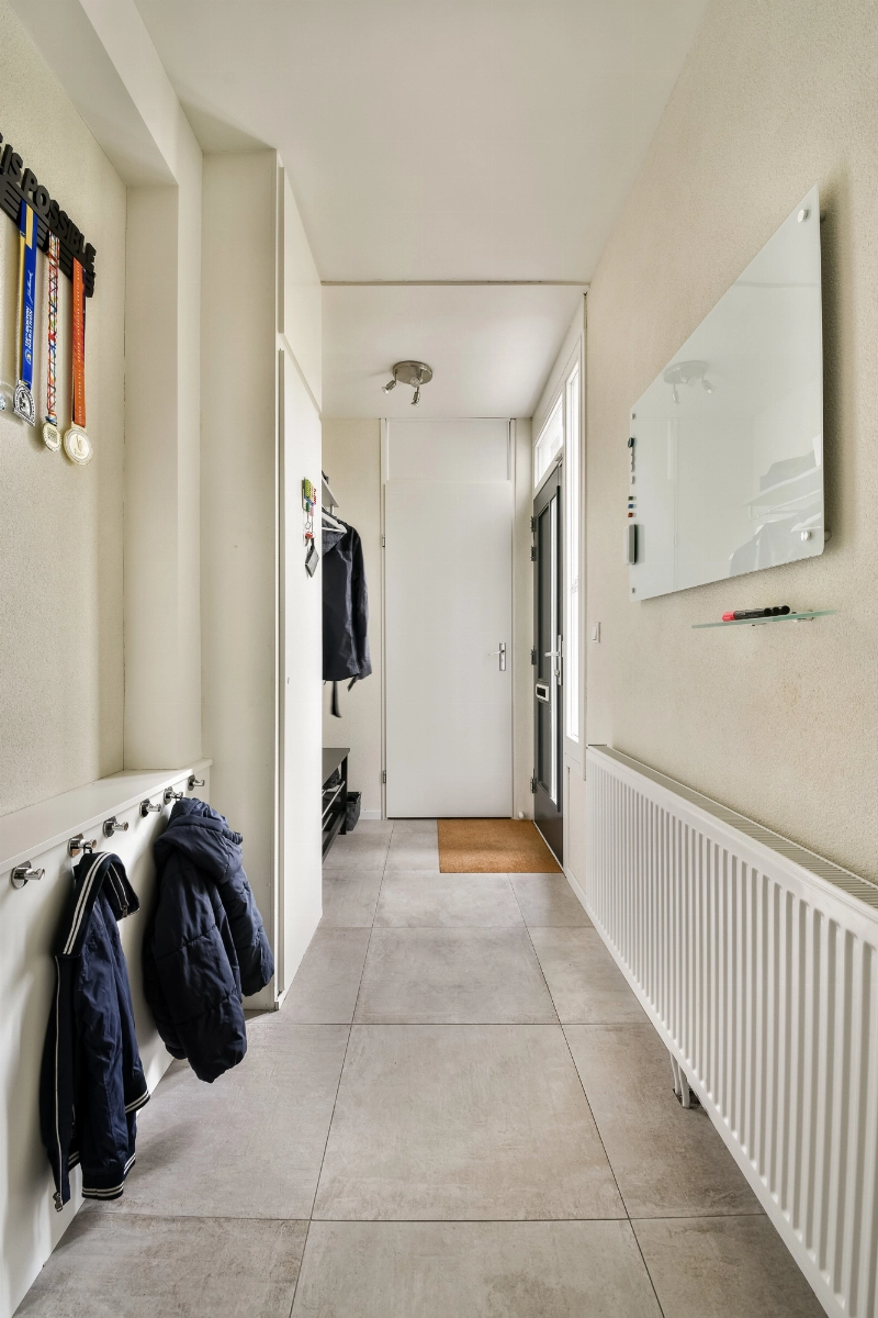 Via de verzorgde voortuin voorzien van mooie plantenbakken en een eigen parkeerplaats bereik je de entree. Je komt binnen in een ruime hal met een garderobenis, modern wit-antraciet betegeld toilet voorzien van zwevend closet en fontein, meterkast en de trapopgang naar 1e verdieping. Via de tussendeur komt u in de royale en lichte woonkamer terecht. De ruimte is afgewerkt met een mooie betonlook plavuizen vloer met vloerverwarming en spachtelputz wanden. Tevens is er een handige trapkast met veel bergruimte.