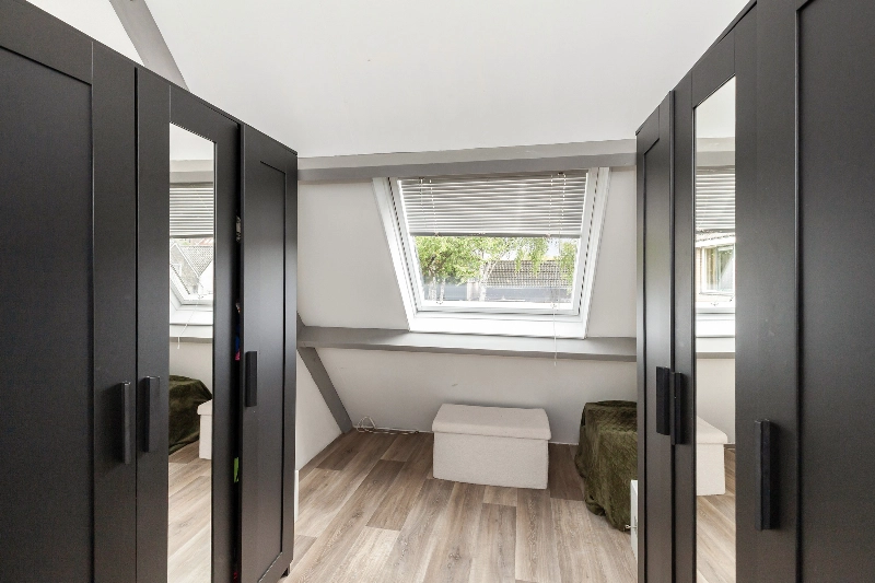 De grote zolderkamer heeft een groot dakraam, een wastafel met spiegel en praktische opbergruimte achter de knieschotten. Perfect als extra slaapkamer, werkkamer of hobbyruimte.