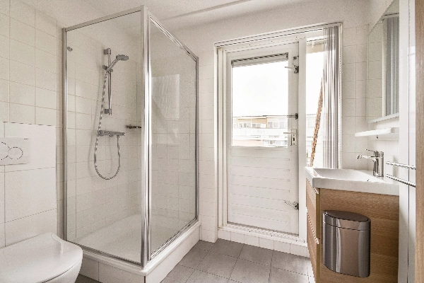 De moderne badkamer is afgewerkt met witte wandtegels en grijze vloertegels en beschikt over een douchehoek met glazen wand, een zwevend toilet, een wastafelmeubel met een dimbare en verwarmde spiegel, een badkamerkast en een moderne radiator. Vanuit de badkamer stap je zo het balkon op.