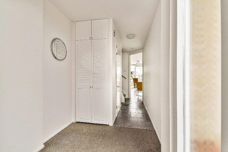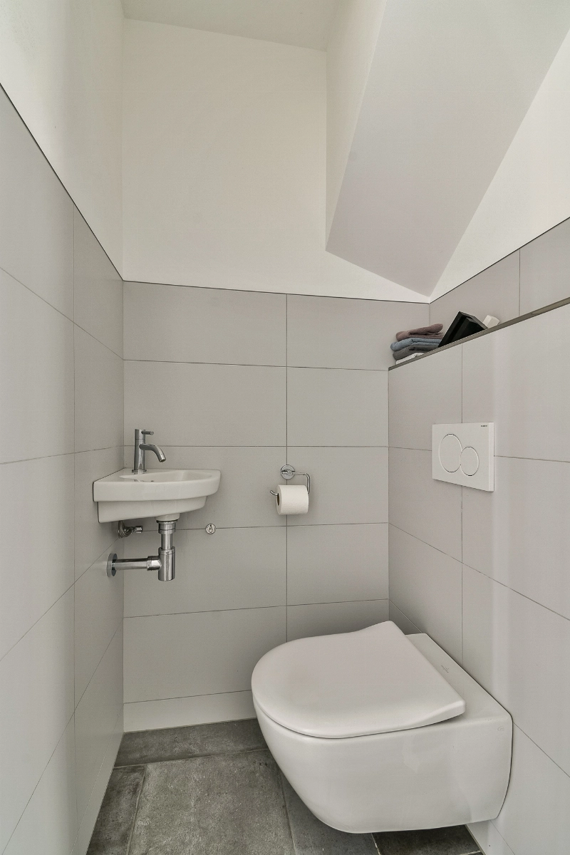 Via de entree stap je binnen in een lichte, ruime hal met strak gestucte wanden. Hier vind je de meterkast met 12 groepen. De moderne toiletruimte heeft lichtgrijze betegeling, een zwevend toilet en een fonteintje.