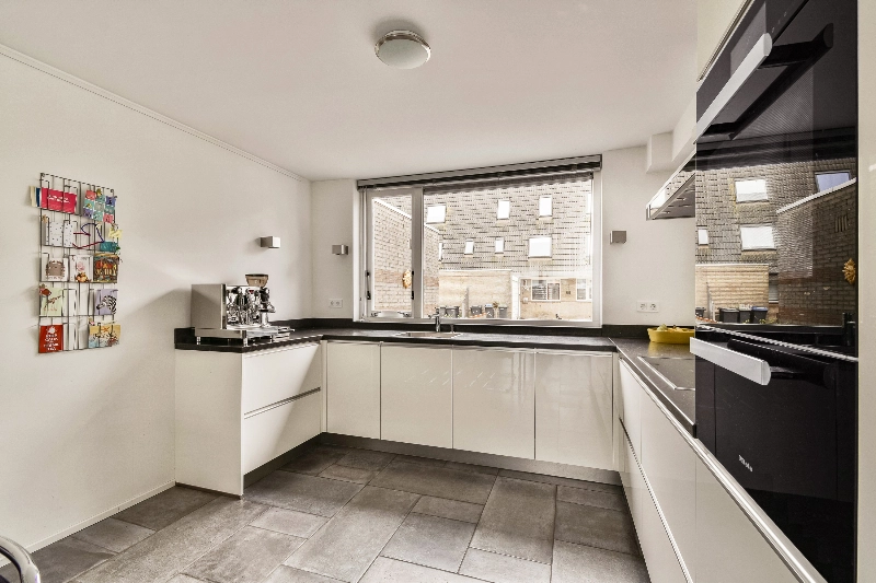 Aan de voorzijde van de woning bevindt zich de moderne hoogglans witte keuken met een antraciet composiet aanrechtblad. De keuken is uitgevoerd in een U-opstelling en voorzien van de volgende Miele inbouwapparatuur; een inductiekookplaat, een RVS afzuigkap, een koelkast, een vriezer, een combi-stoomoven, een warmhoudlade, een vaatwasser, een close-in boiler en veel handige bergruimte in de lades en Lemans hoekkasten. Het keukenraam is voorzien van een knik arm zonnescherm.