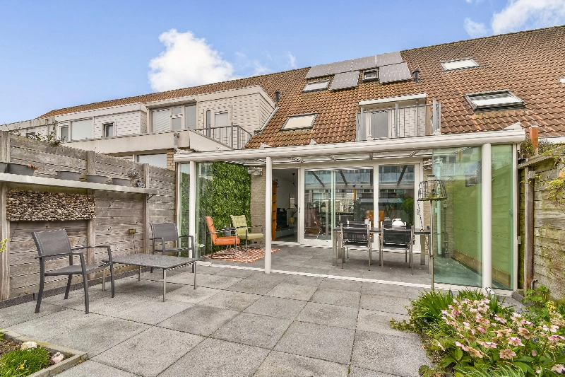 De grote glazen pui met dubbel gelaagd veiligheidsglas en twee schuifdeuren zorgt voor veel lichtinval en geeft direct toegang tot de glazen overkapping. De overkapping heeft een glasschuifwand en kan verwarmd worden met twee heaters, waardoor je het gehele jaar door hier kunt vertoeven.