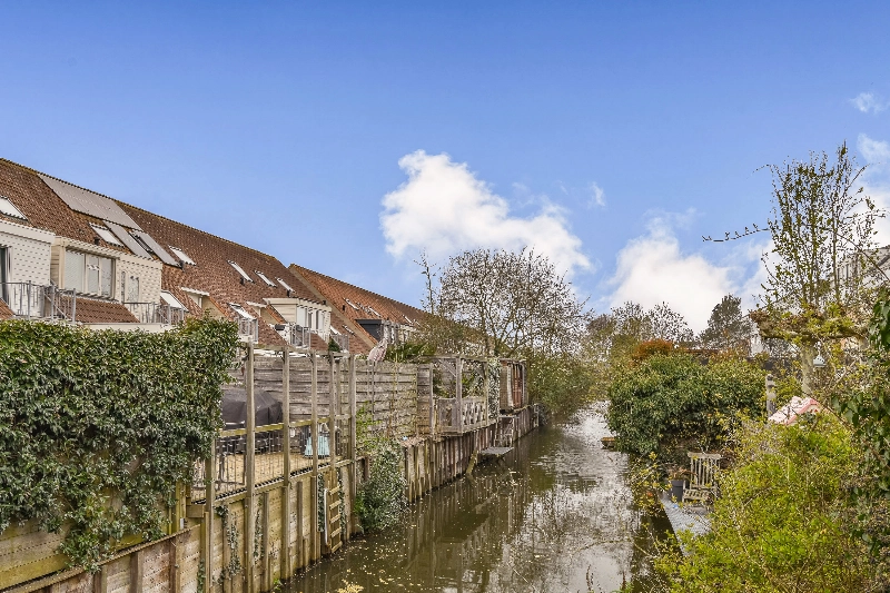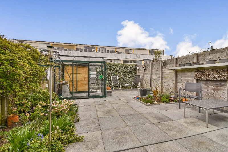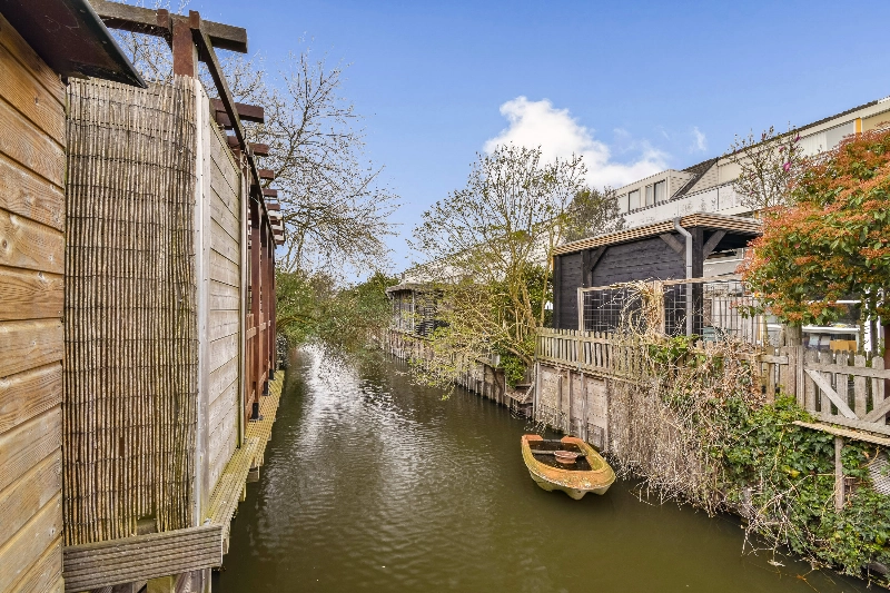 De achtertuin is modern aangelegd met grijze tegels, een houten berging en groenblijvende beplanting. En als extra pluspunt: de tuin grenst direct aan het water.