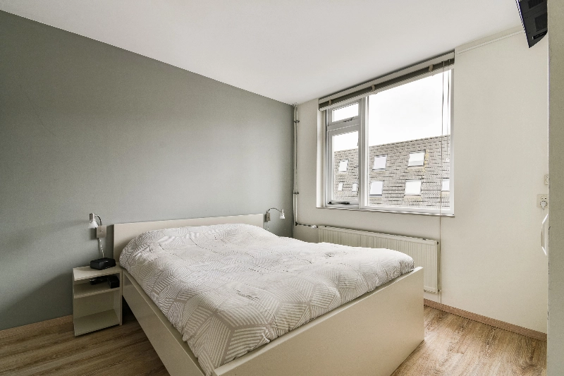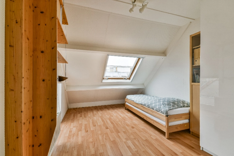 De ruime zolderkamer met een grijze houtlook laminaatvloer, een raampartij aan de voorzijde en een kunststof dakraam aan de achterzijde, wat zorgt voor een prettige lichtinval.