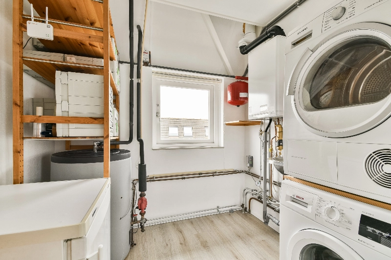 De wasruimte is voorzien van aansluitingen voor een wasmachine en droger, en hier bevinden zich ook de c.v. combiketel (Intergas 2023) en de zonneboiler.