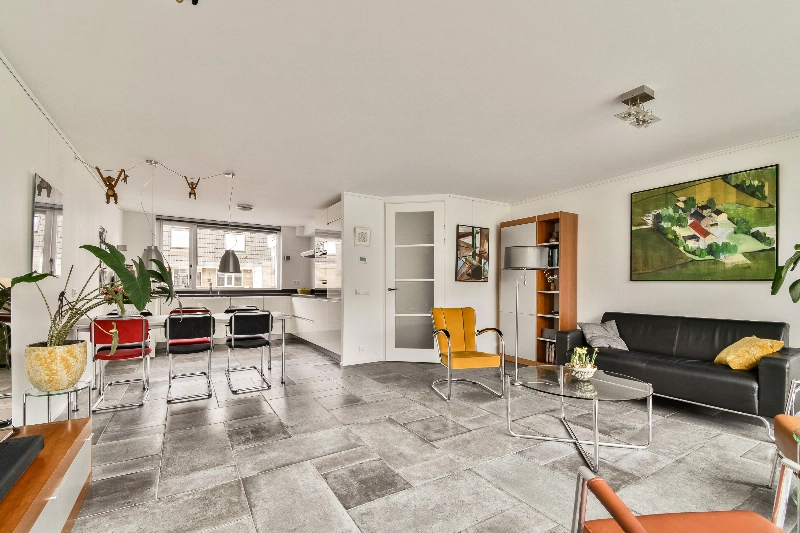Een mooie deur met glasverdeling geeft toegang tot de gezellige en lichte woonkamer. Op de geïsoleerde vloer ligt een mooie warmgrijze plavuizen vloer met comfortabele vloerverwarming als hoofdverwarming. De vloerverwarming loopt door naar de keuken, hal en toilet. De wanden zijn strak gestuct, wat zorgt voor een moderne uitstraling.