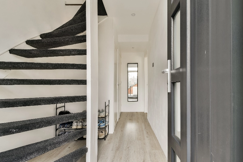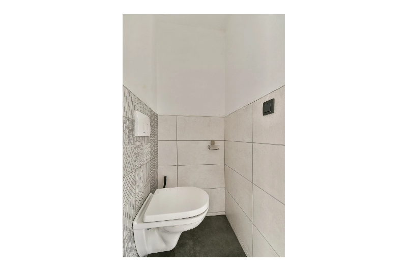Via het ruime dakterras, dat tevens dienstdoet als entree, betreed je de woning. In de hal bevinden zich de meterkast (voorzien van 8 groepen en 3 aardlekschakelaars+hoofdschakelaar), de trapopgang naar 2e verdieping en een modern betegeld toilet uitgevoerd met zachtgrijze betegeling en voorzien van een zwevend toilet.