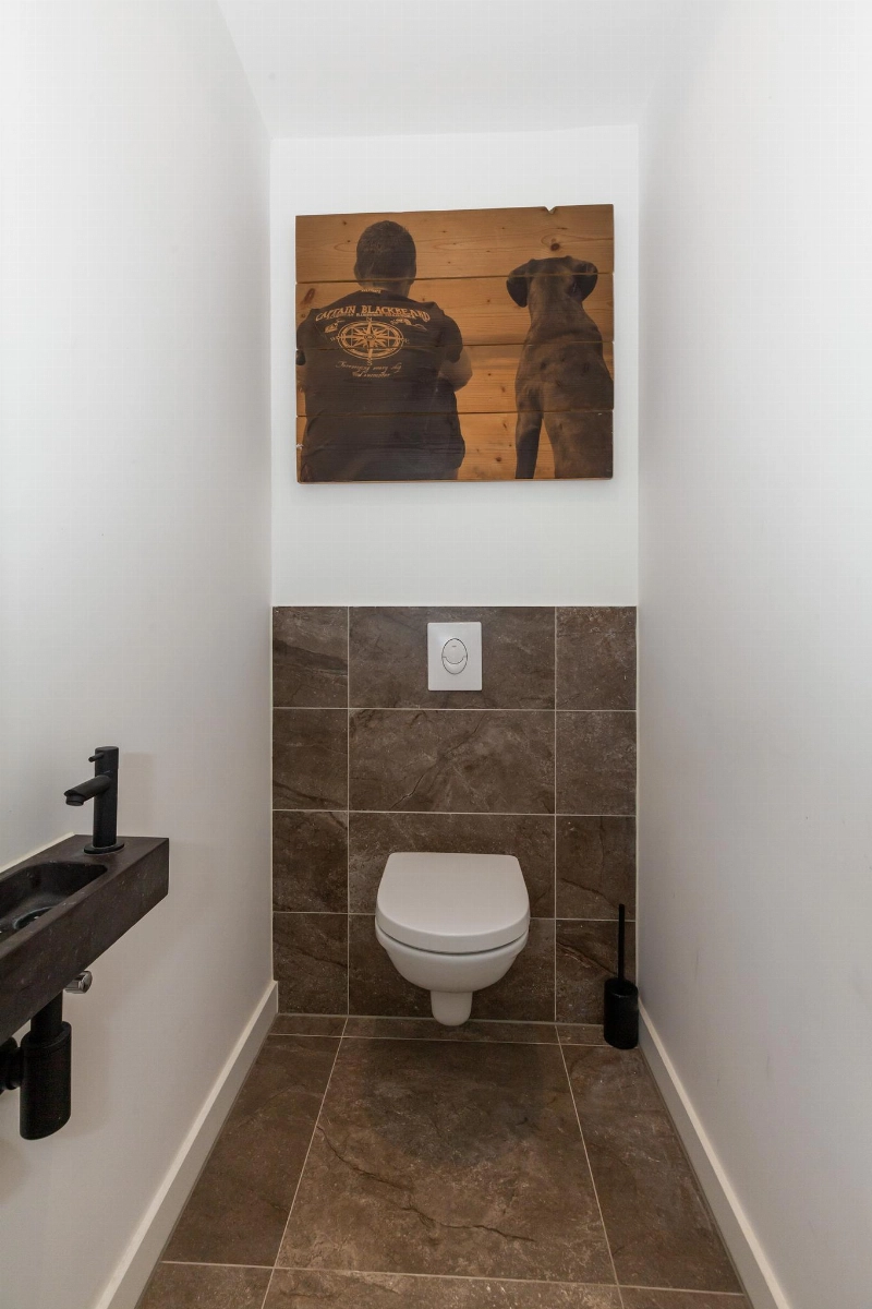 Het gedeeltelijk betegelde toilet is ruim bemeten en voorzien van een zwevend closet en fontein.