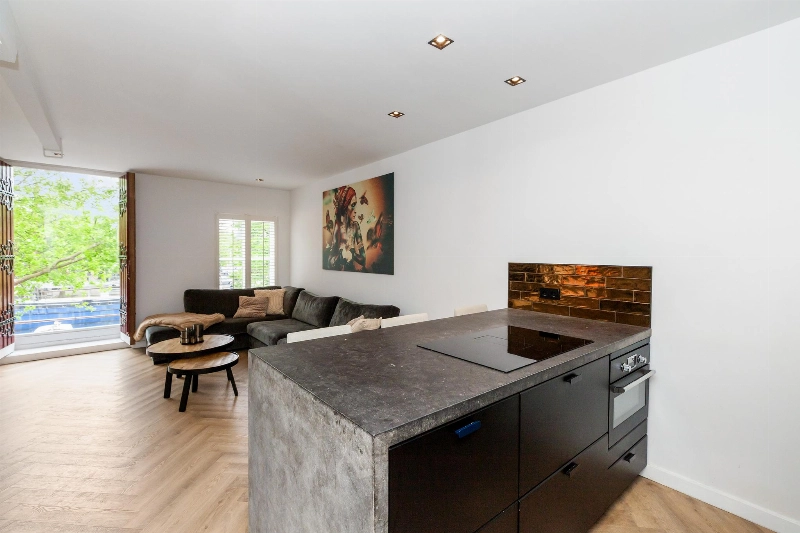 Voordeur, open gang met doorloop naar de woonkamer met veel ramen en een mooi uitzicht op het water. Deze brede kamer geeft voldoende ruimte voor een riante zithoek en er is in de woonkamer vloerverwarming aanwezig. Er is een open keuken met een prachtig Belgisch hardstenen aanrechtblad en wandopstelling voorzien van koelkast, vriezer en een vaatwasser. Het schiereiland is voorzien van een eetbar, inductiekookplaat met afzuiging, een combi-oven en veel bergruimte door middel van lades.