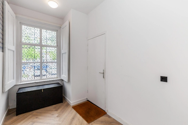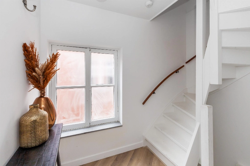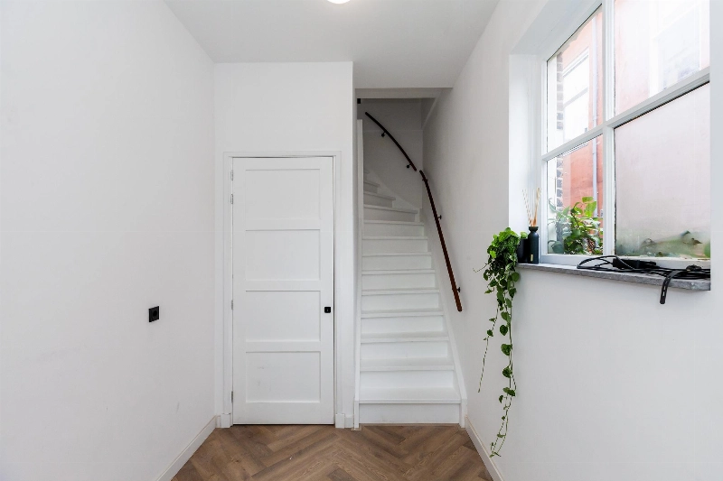 Via de prachtige entreedeur met intercom kom je in een hal met tussendeur naar het ruime trappenhuis. Hier vind je ook je eigen berging. Via de trap bereik je de 1e verdieping met voordeur naar het appartement.