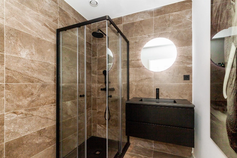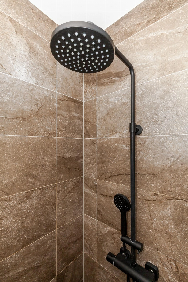 De geheel modern betegelde en deels gestucte badkamer is voorzien van vloerverwarming, een douchehoek, wastafelmeubel met daarboven een verlichte spiegel en spots in het plafond.
