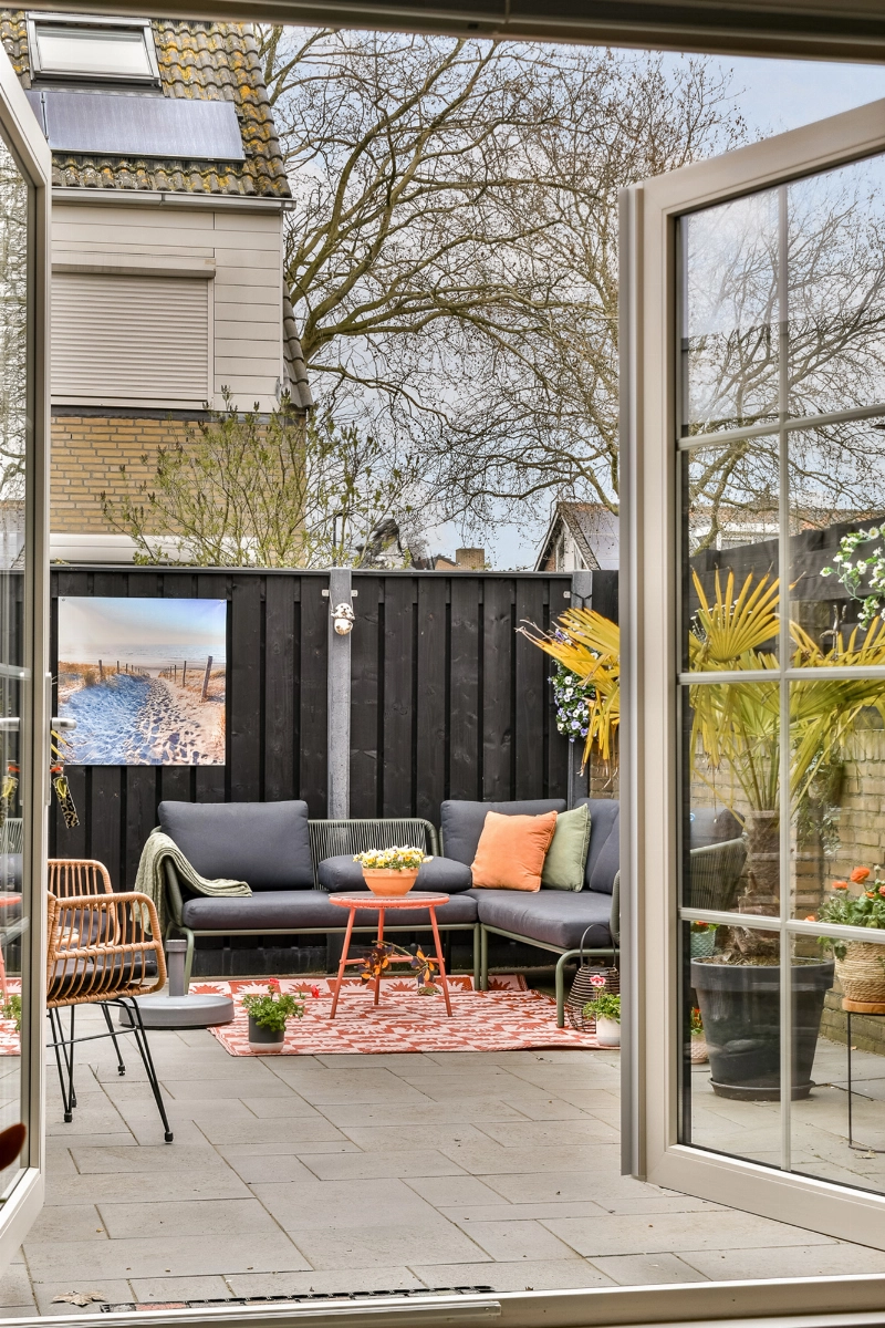 De lichte woonkamer is stijlvol afgewerkt met een mooie donkere plavuizen voorzien van vloerverwarming en sfeervolle openslaande deuren naar de gezellig ingerichte tuin — perfect voor binnen-buiten leven!