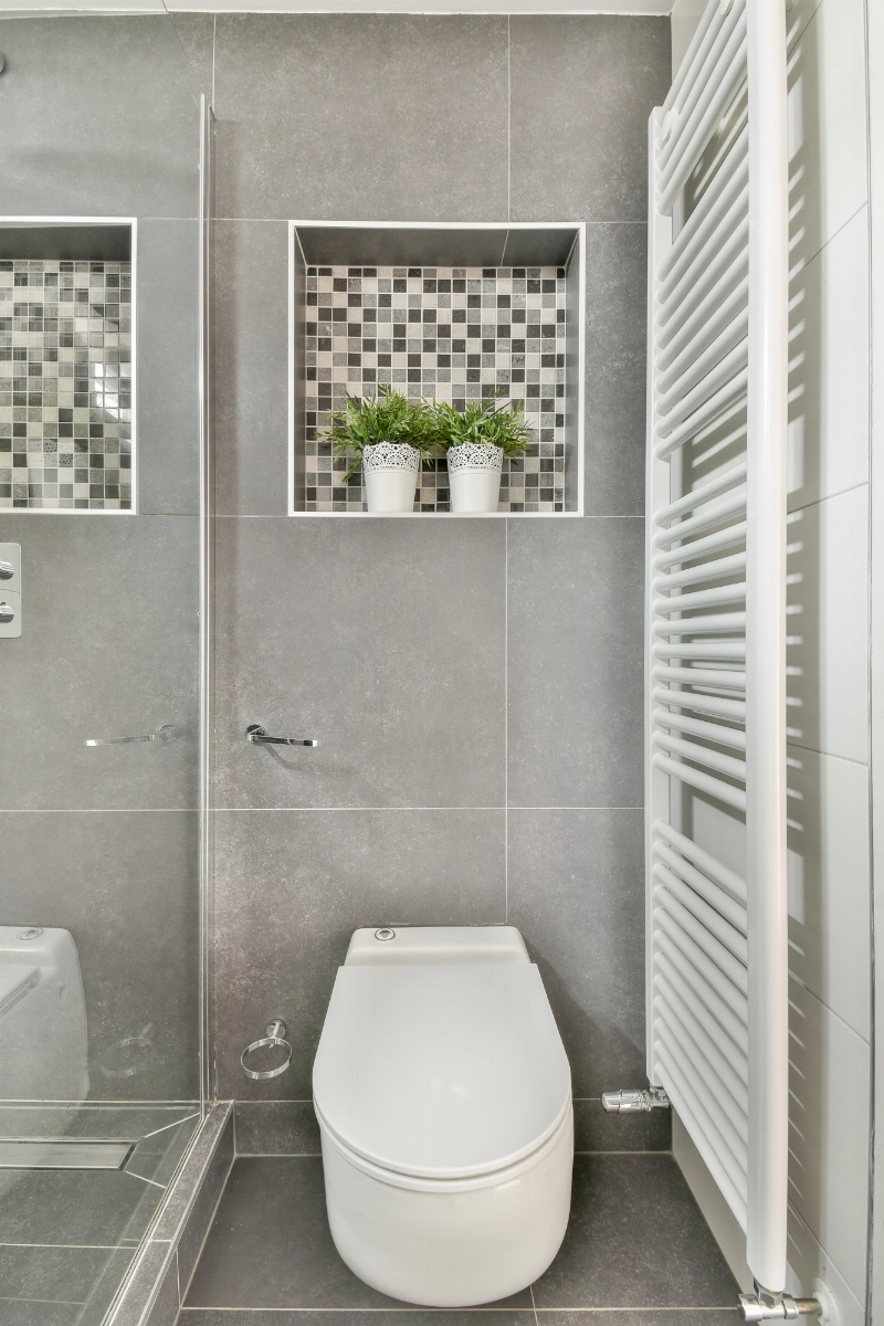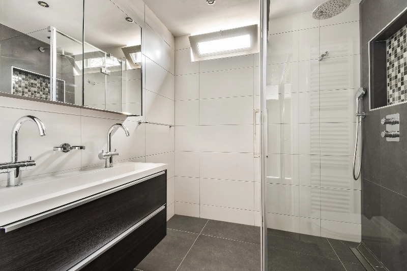 De moderne badkamer is stijlvol betegeld met witte wand- en grijze vloertegels en is uitgerust met een breed wastafelmeubel, douchehoek, designradiator en een zwevend toilet en er zijn speelse nisjes welke zijn afgewerkt met mozaïektegels.