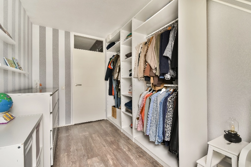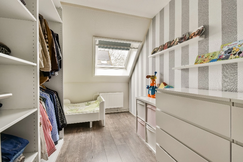 De 2e slaapkamer ligt ook aan de achterzijde en is voorzien van een dakraam en is in gebruik als kleedkamer.