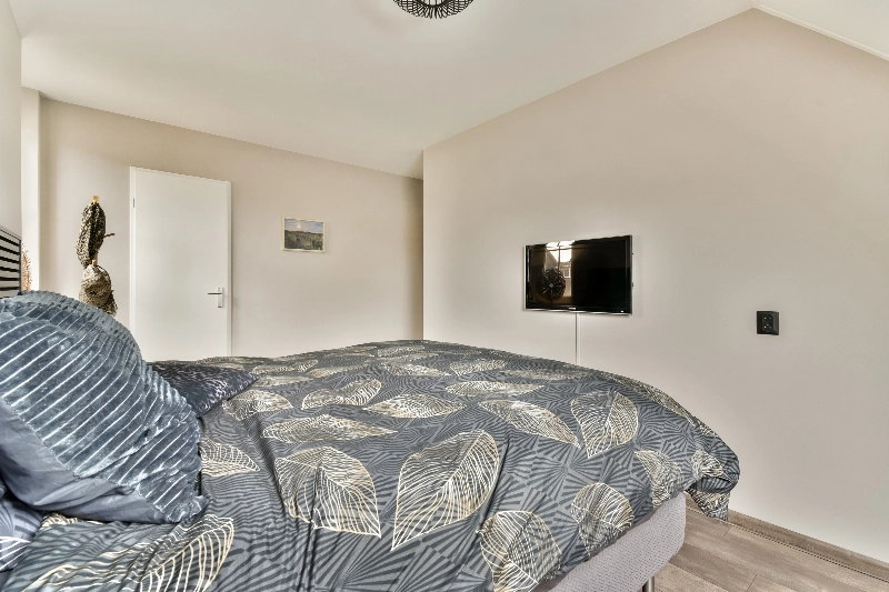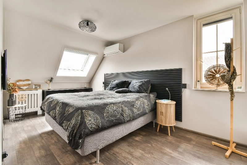 De ruime hoofdslaapkamer is gelegen aan de achterzijde en beschikt over een dakraam, kunststof draai-kiepraam, een splitairco, een vaste lattenachterwand voor het bed en een inbouwkast en zowel de muren als het plafond zijn strak gestuct.