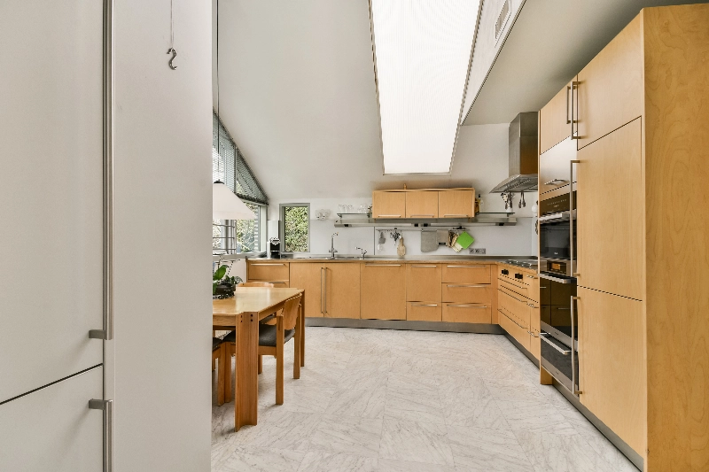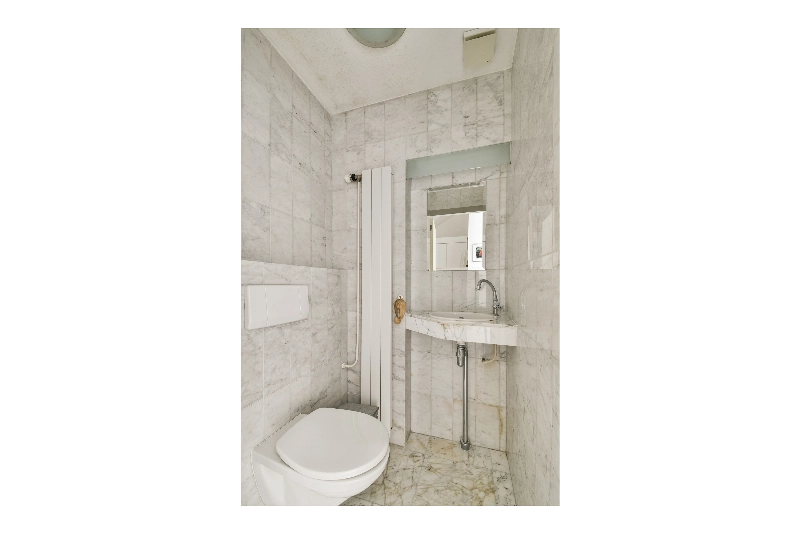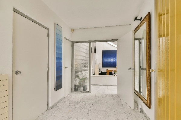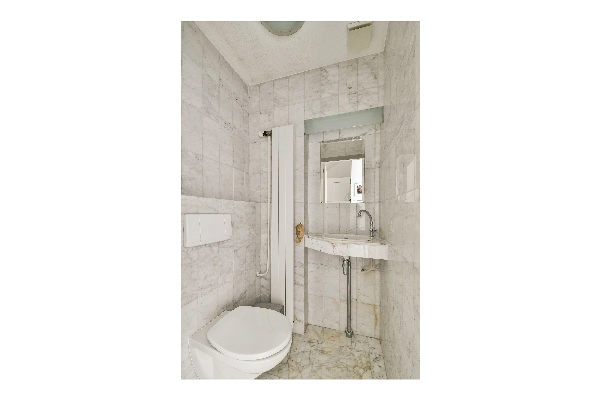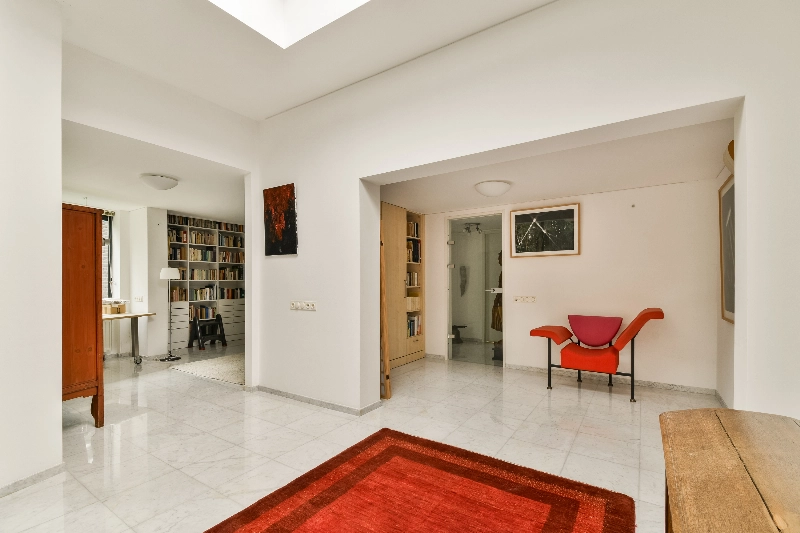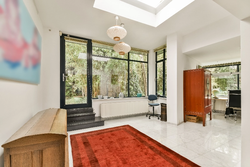 De marmeren plavuizen op de vloer lopen door over de gehele benedenverdieping en geven het geheel een luxe uitstraling.