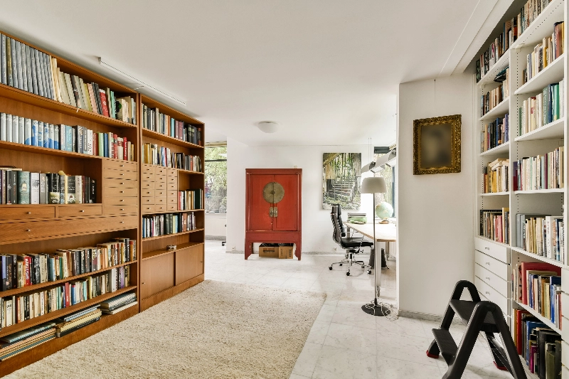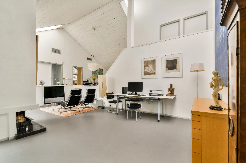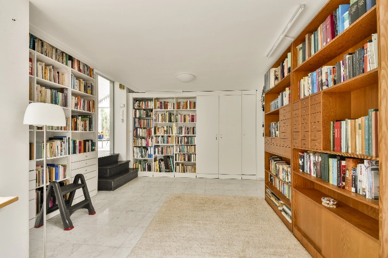 Via de doorgang komt u in de woonkamer, die dankzij de niveauverschillen is opgedeeld in diverse sfeervolle vertrekken. Denk aan een zithoek, een tuinkamer met open haard en uitzicht op de vijver, en een royale zitkamer waar momenteel een vleugel staat opgesteld. Via de bibliotheek en werkkamer bereikt u een extra kamer aan de achterzijde van de woning. Deze ruimte is goed af te sluiten en uitstekend geschikt als royale slaapkamer. Vanuit deze kamer heeft u tevens toegang tot de tuin. Aangrenzend bevindt zich een volledig wit betegelde badkamer met inloopdouche, wastafel en toilet.