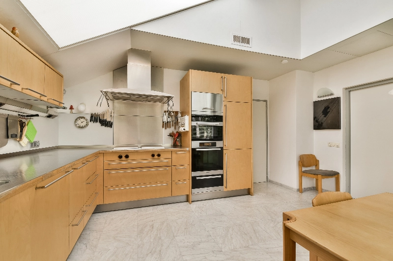 Vanuit de hal bereikt u de keuken, gelegen op de hoek van de woning. Hier geniet u van een kop koffie of bereidt u een heerlijke maaltijd, terwijl u uitkijkt over de straat en de tuin. De ruime beuken hoekopstelling is voorzien van een RVS aanrechtblad en complete inbouwapparatuur, waaronder een koelkast, vriezer, oven, magnetron, vaatwasser, warmhoudlade, een combinatie van elektrische kookplaat en gaspitten en een hogedruk stoomoven.