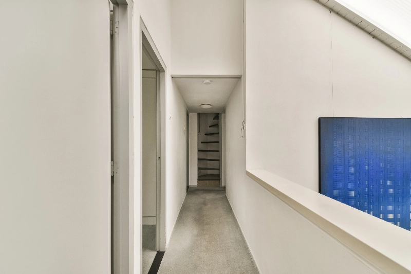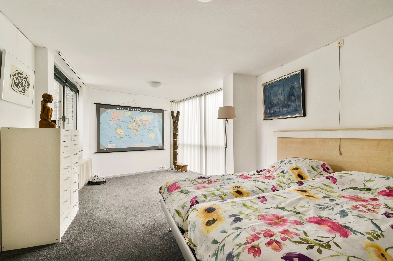 Via een trappetje komt u weer terug in de zithoek, waar zich de trap naar de slaapverdieping bevindt. Deze verdieping staat in open verbinding met de woonkamer, wat zorgt voor een bijzonder ruimtelijk effect.