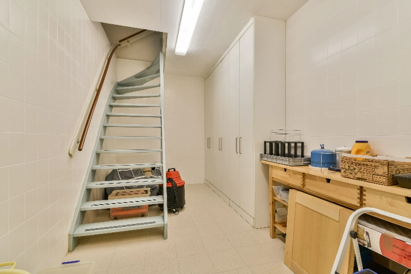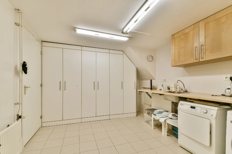 De bijkeuken is momenteel ingericht als ruime wasruimte met aanrecht, vloertegels en aansluitingen voor wasmachine en droger. Hier bevindt zich tevens een luik naar de kruipruimte.
