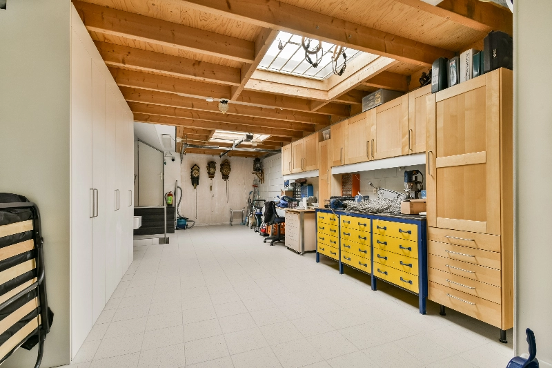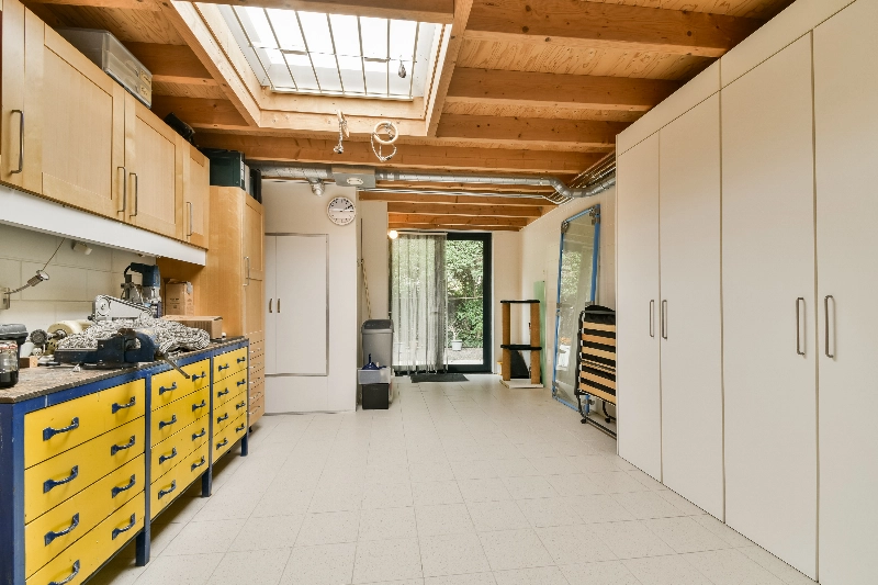 De garage, verbonden met de bijkeuken, is in gebruik als hobbyruimte. Deze ruimte kan desgewenst weer worden ingericht als garage. De ruimte is voorzien van twee daklichten, verwarming en een kast met opstelplaats voor de cv-installatie. Via de garage heeft u toegang tot de kelder: een droge, betegelde ruimte met praktische kastruimte.