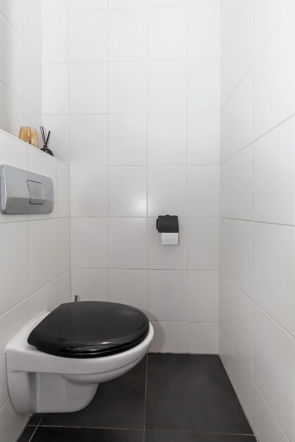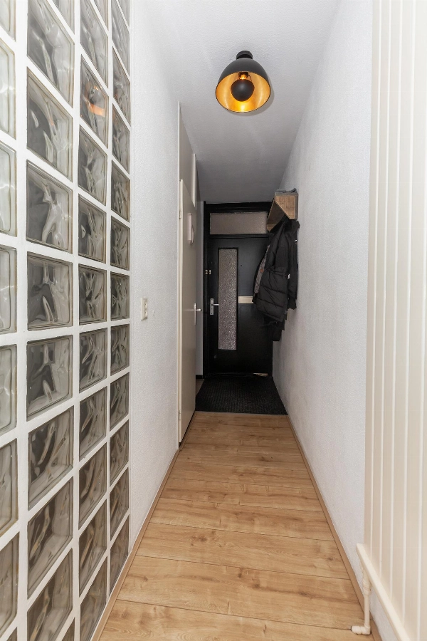 Entree, ruime gang met laminaatvloer met een handige wasruimte voor de wasmachine en droger. Het toilet is geheel betegeld met witte wandtegels en antraciet vloertegels. Meterkast en een 2e kast met de opstelling van de c.v. combiketel.
