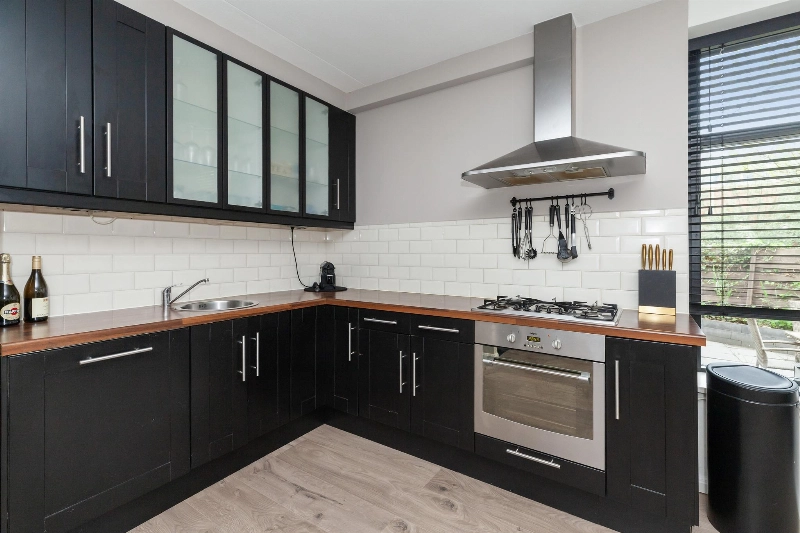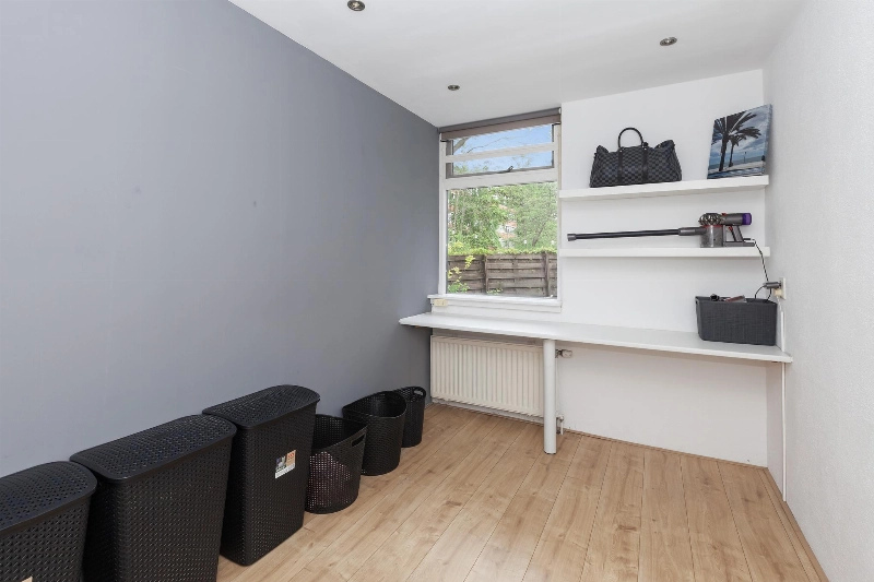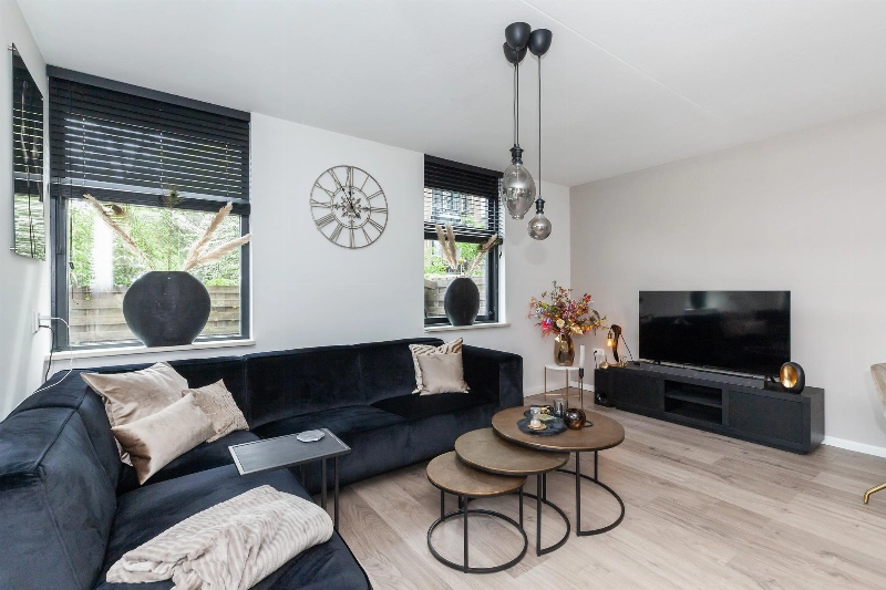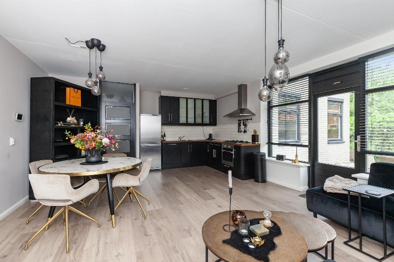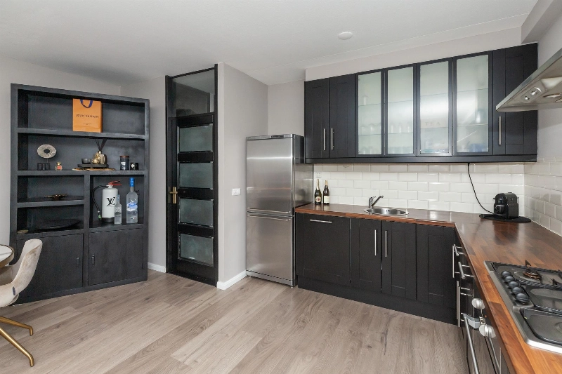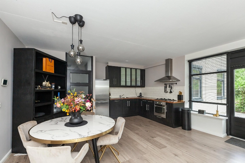 Mooie ruime woonkamer met grote raampartijen en een leuk uitzicht op de tuin. Op de vloer ligt een houtlook laminaatvloer en de wanden zijn gestuct. De open keuken is zwart geschilderd en heeft een houtlook aanrechtblad, een vaatwasser, een oven, een 5 pits gaskookplaat met RVS afzuigkap en een losse koel-/vriescombinatie (blijft achter).