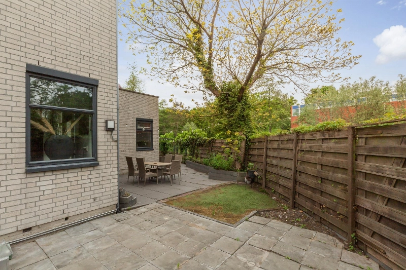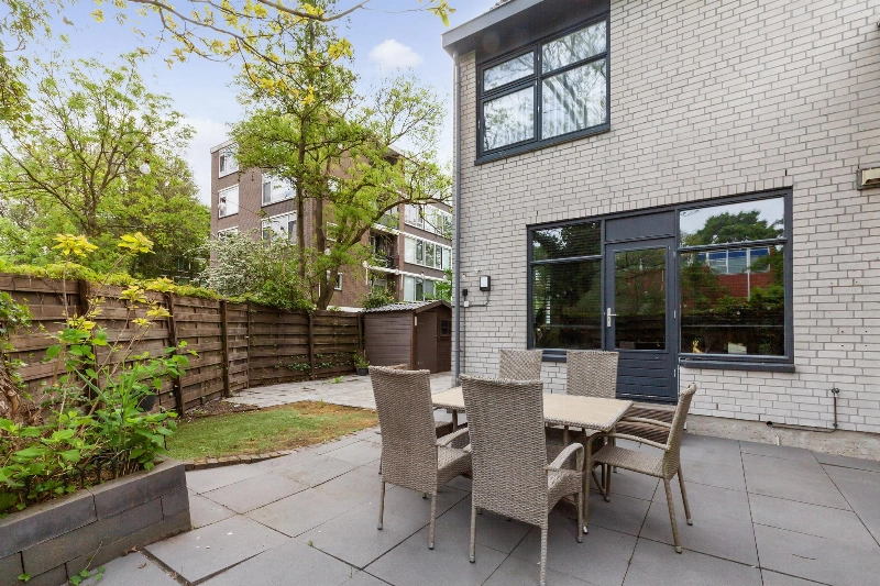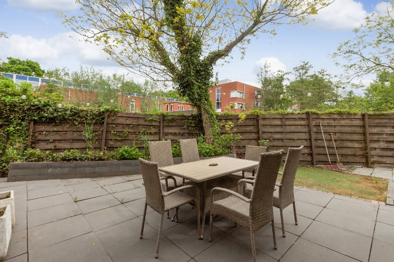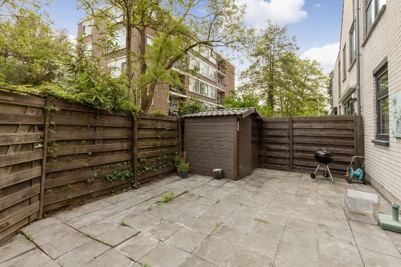 Vanuit de de woonkamer heeft u toegang tot de heerlijke tuin. Hier kunt u echt genieten van de rust. De tuin grenst aan een wandelpad welke met veel groen is afgescheiden en via een achteruitgang kan je zo vissen in de vijver. De tuin geeft veel privacy en door de hoekligging van de tuin zijn er volop mogelijkheden om met de zon mee te draaien. Om de hoek bevindt zich een extra stuk tuin van 45 m² waar je heerlijk over het water kunt uitkijken. Ook is er een grote houten berging in de tuin.