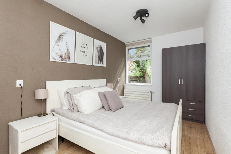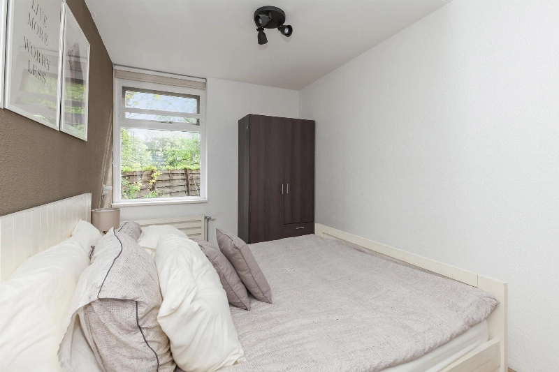 Slaapkamer I heeft een verlaagd plafond en zicht op de tuin.