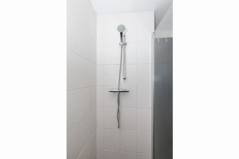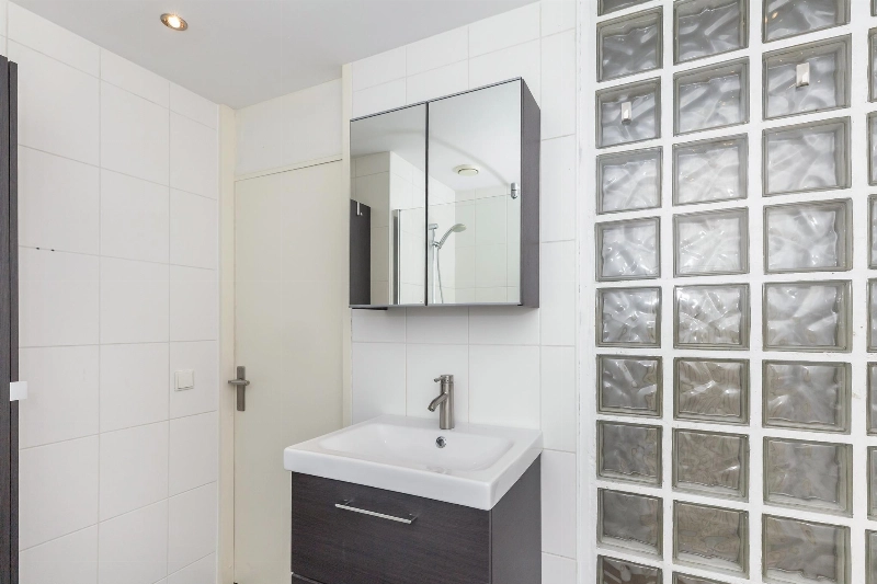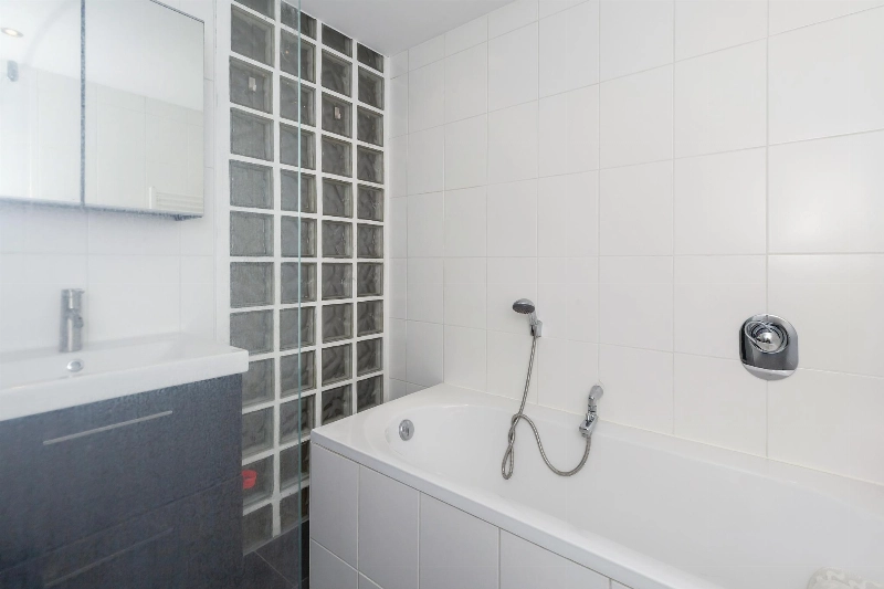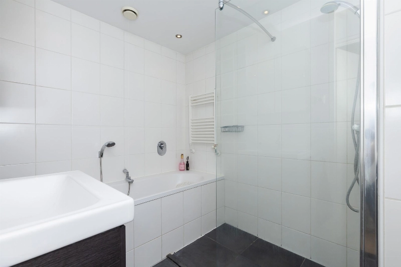 Aan de andere zijde van de gang bevindt zich de moderne badkamer. Ook deze is betegeld met witte en antraciet tegels en beschikt over een inloopdouche met een glazen wand, een ligbad, een wastafelmeubel met waskom, een handdoek radiator en een verlaagd plafond met spots.
