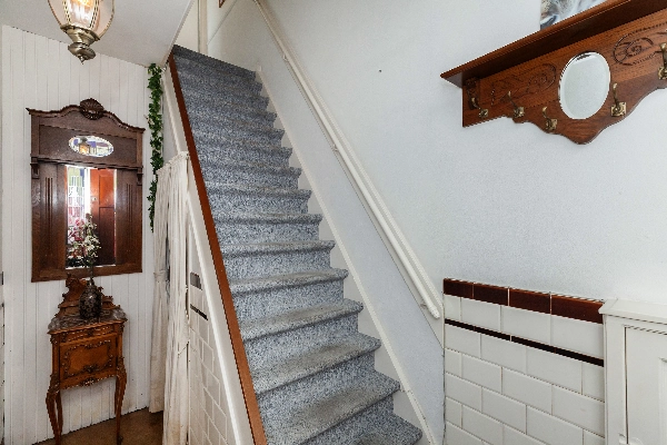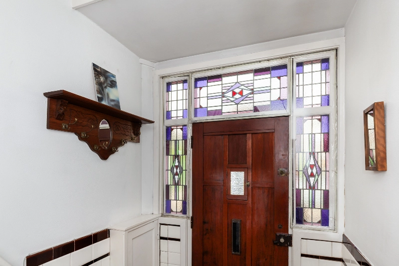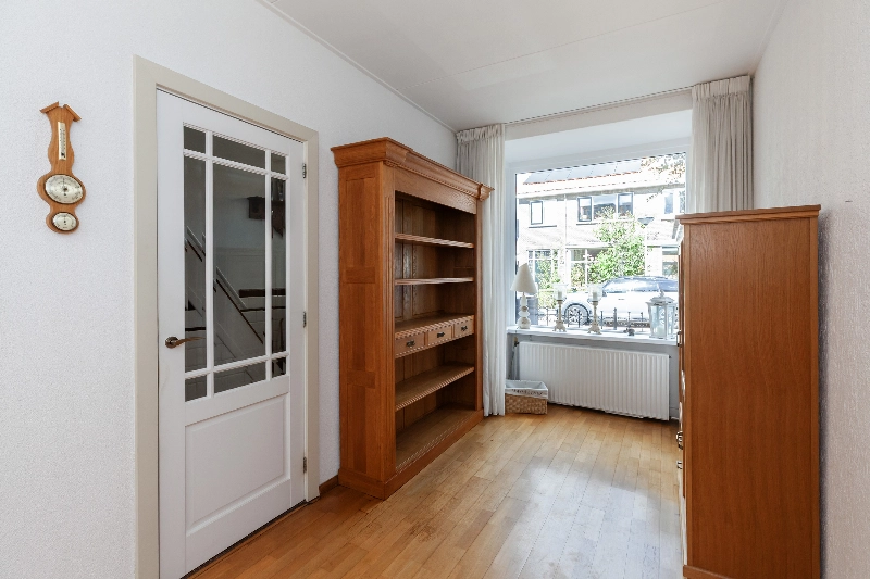 Via de keurig aangelegde voortuin met klassiek smeedijzeren hekwerk betreedt u de woning. U komt binnen door de originele voordeur met karakteristieke glas-in-loodramen in een ruime hal met authentieke wandbetegeling en glas-in-looddetails. In de hal bevinden zich de meterkast (voorzien van 7 groepen, fornuisgroep, aardlekschakelaar) en handige opbergruimte onder de trap.