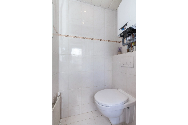 Grenzend aan de keuken vindt u een tussenhal met toegang tot het toilet, voorzien van licht tegelwerk, een zwevend toilet, een radiator en de opstelplaats van de c.v. combiketel (Remeha 2021).
