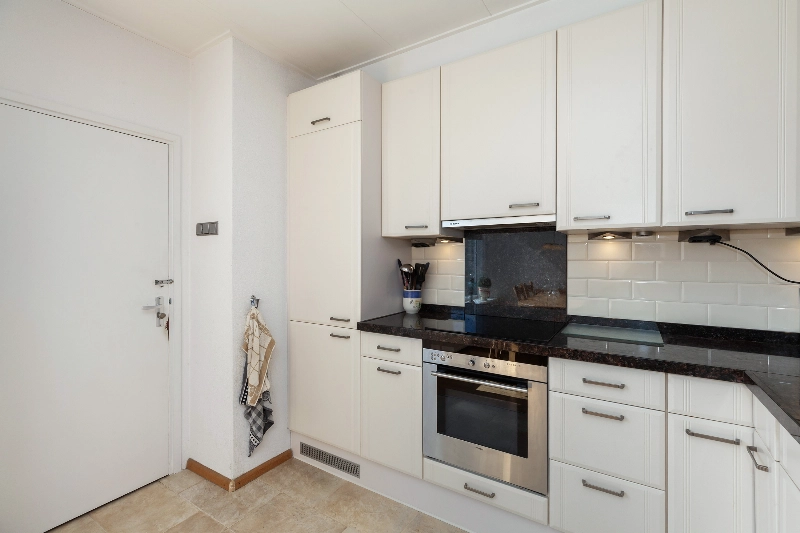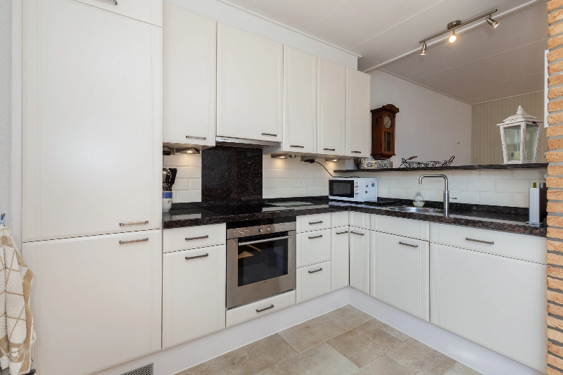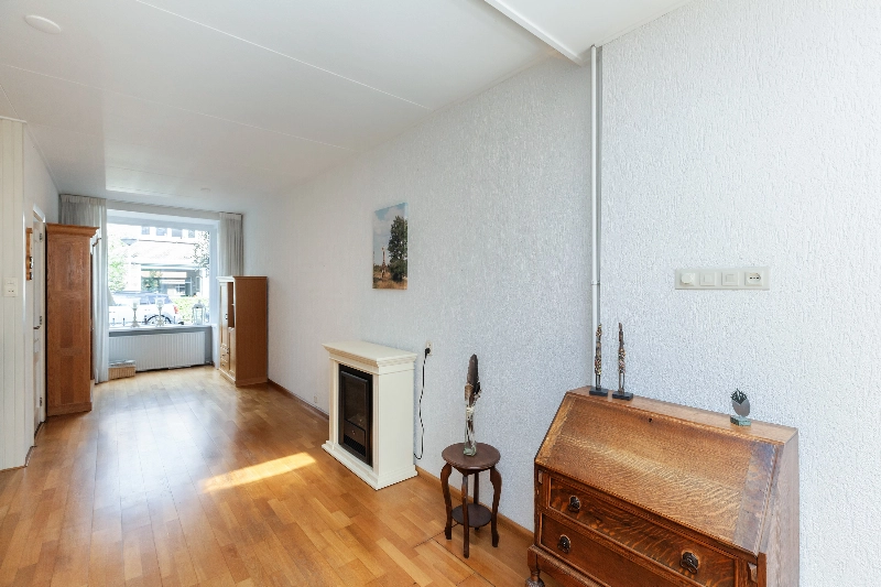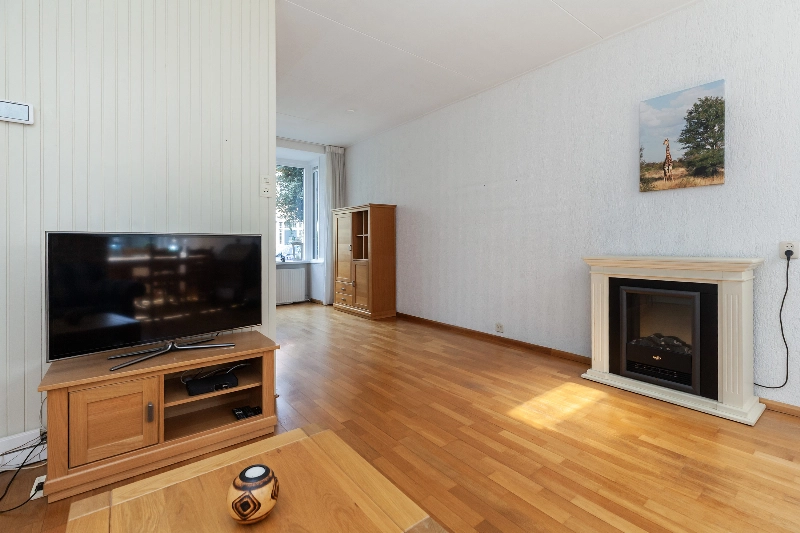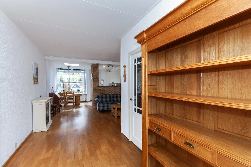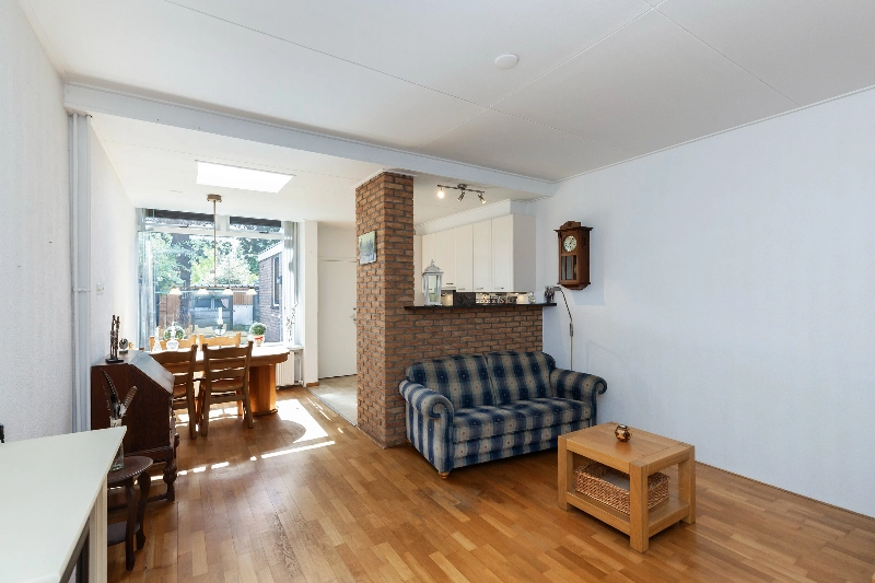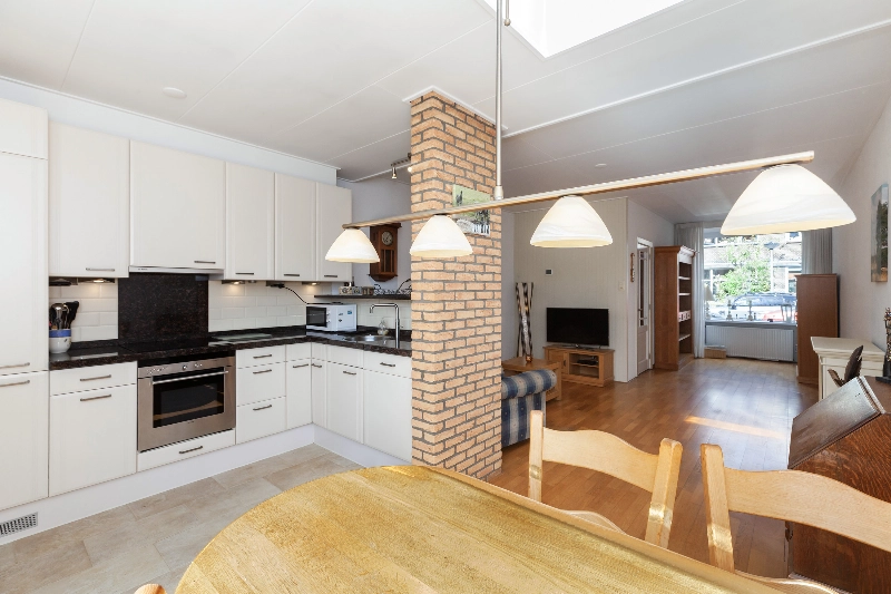 De ruime woonkamer heeft aan de voorzijde een sfeervolle erker met een kunststof kozijn. Op de vloer ligt een houten parketvloer en de wanden zijn afgewerkt met granol/spachtelputz. Aan de tuinzijde is de woonkamer uitgebouwd, waarbij een grote dakkoepel zorgt voor een veel lichtinval in de open keuken. De keurige keuken is uitgevoerd in het wit met een natuurstenen aanrechtblad en beschikt over een inductiekookplaat met vlakschermafzuigkap, een koelkast, een vriezer, een oven, een vaatwasser en een Quooker kraan.