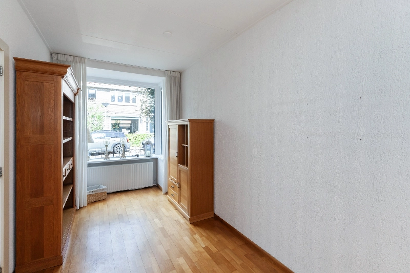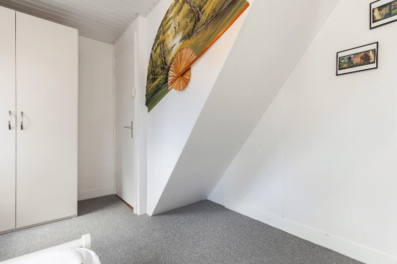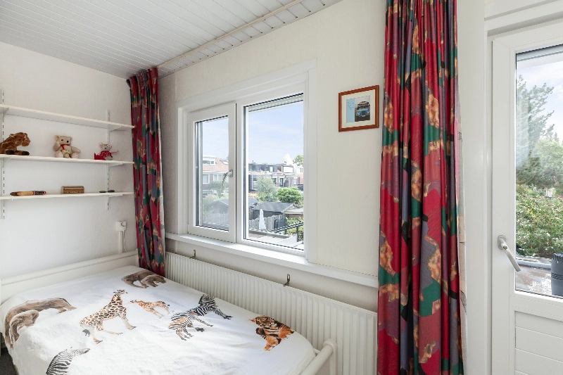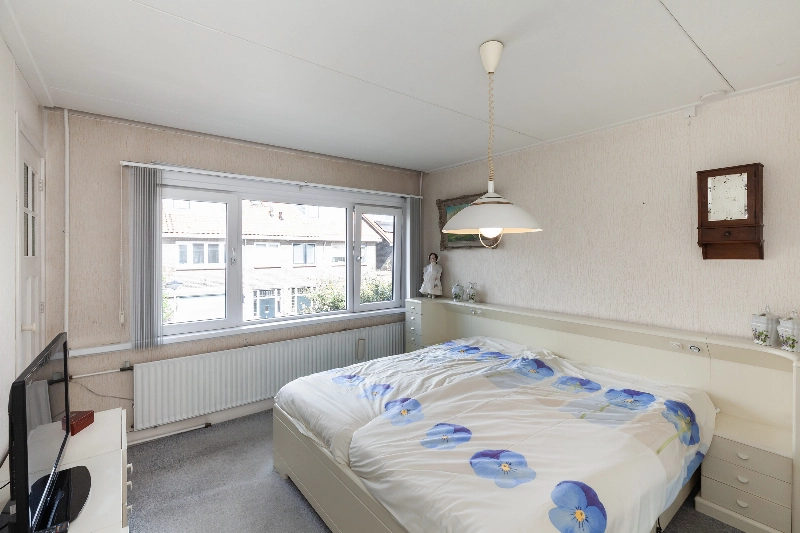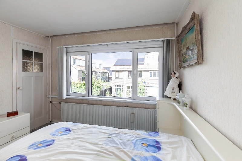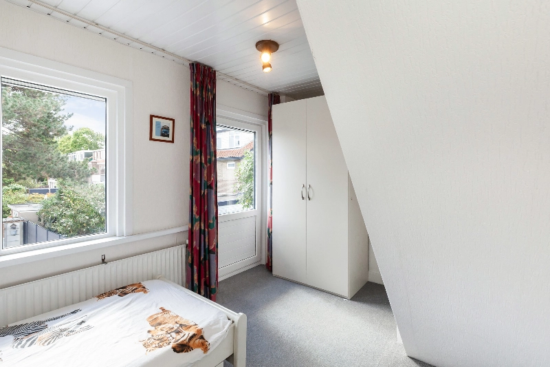 Aan de achterzijde van de woning bevindt zich een twee slaapkamer met eveneens een kunststof kozijn, en voorzien van praktische rolluiken voor extra comfort.