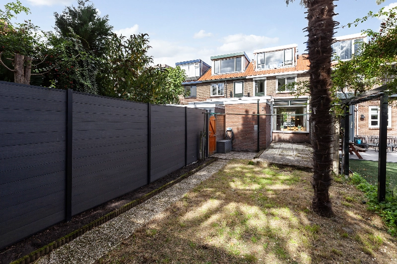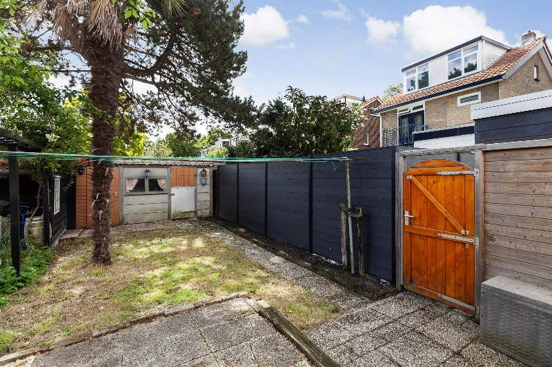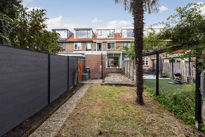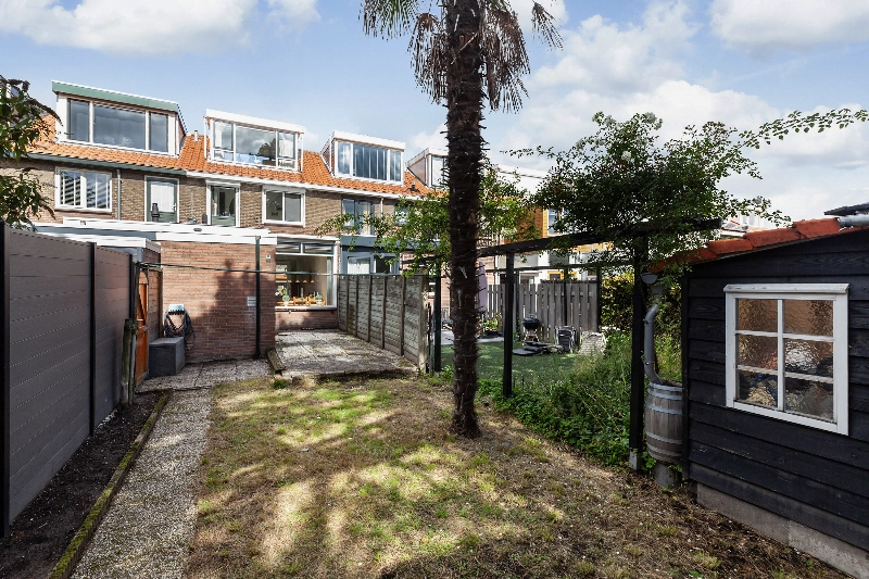 De zonnige op het zuiden gelegen achtertuin is aangelegd met een terras en gras. Achterin bevinden zich twee bergingen - ideaal voor fietsen, gereedschap of extra opslag. Er is een achterom met een steeg welke uitkomt op de Anthony Knottenbeltsingel.