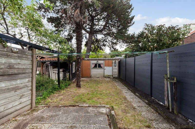 Grenzend aan de keuken vindt u een tussenhal van waaruit u toegang heeft tot de zonnige, op het zuiden gelegen achtertuin tuin van maar liefst 14 meter diep - ideaal om heerlijk te ontspannen of gezellig te tuinieren. Achterin deze diepe tuin vindt u twee praktische bergingen.