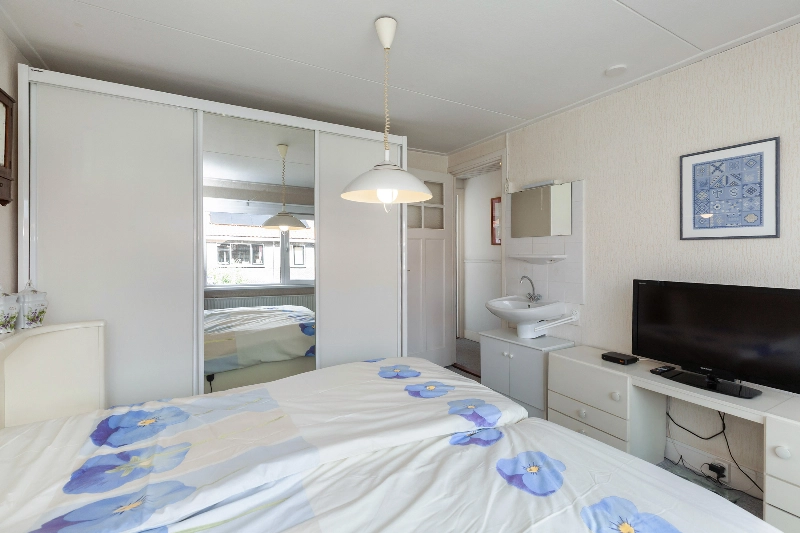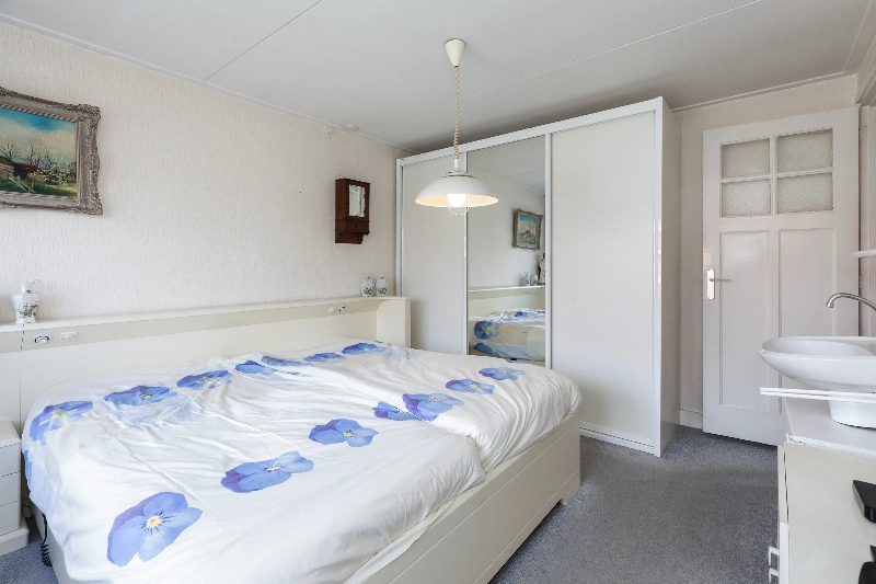 Aan de voorzijde bevindt zich een ruime slaapkamer met een kunststof kozijn en HR++ beglazing. Deze kamer beschikt over een kast met een fraai glas-in-loodraam en een wastafelmeubel.