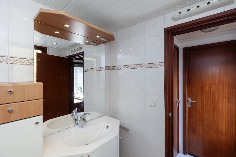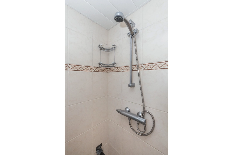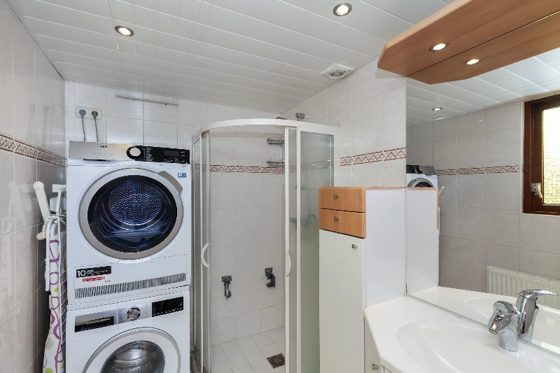 De lichte badkamer is bereikbaar via dezelfde hal en beschikt over een douchehoek, een wastafelmeubel, een radiator en de aansluitingen voor een wasmachine en droger.