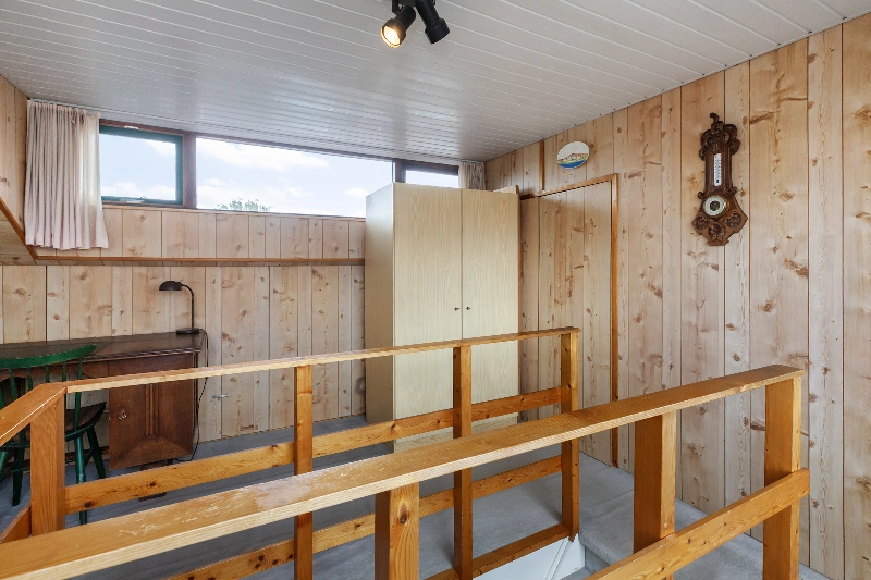 Riante zolderkamer, gerealiseerd dankzij een dakkapel over de volledige nokbreedte. De kamer biedt volop daglicht en extra bergruimte achter de grote schotten - ideaal als derde slaapkamer, werkruimte of hobbykamer.