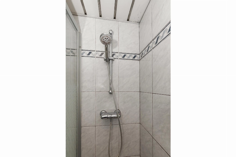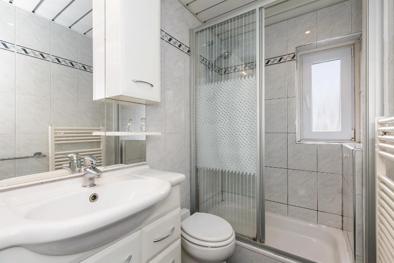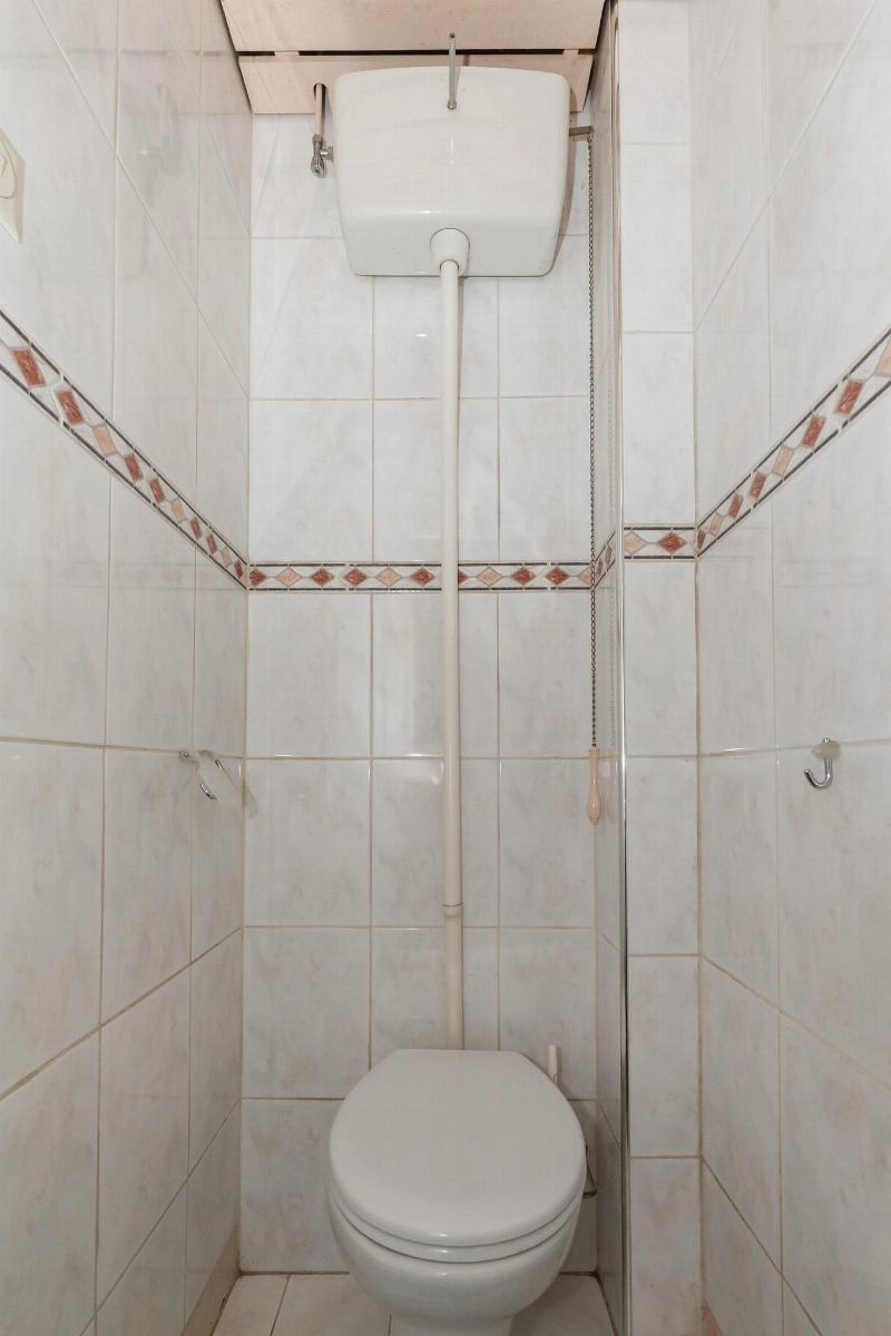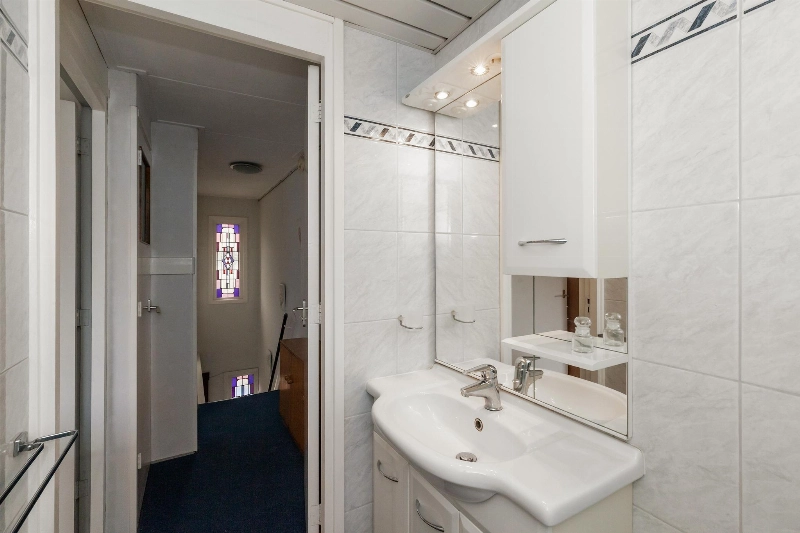 De badkamer is geheel betegeld en uitgevoerd met een douchebak met deur, 2e toilet (sanibroyeur), een wastafelmeubel en een radiator.