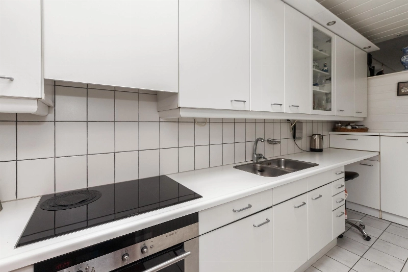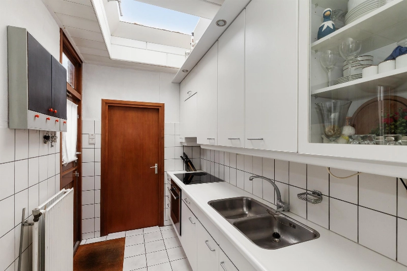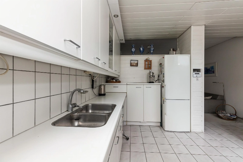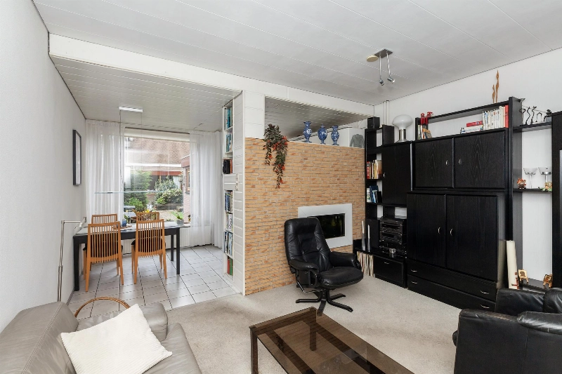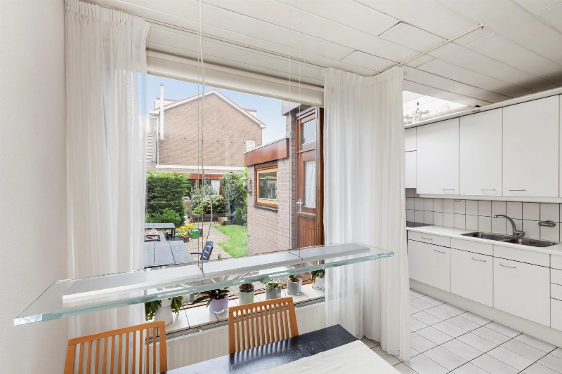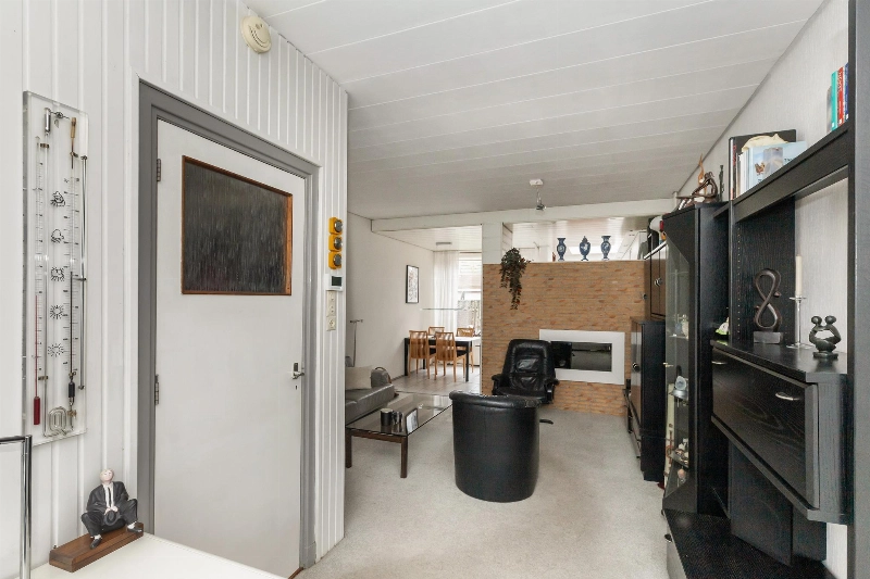 Entree, gang met meterkast, kelderkast en geheel betegelde toiletruimte. Via de tussendeur bereik je de woonkamer. Door de uitbouw aan de achterzijde is de kamer goed in te delen. Zo is er een ruime zithoek en loopt deze door naar de uitbouw waar genoeg ruimte is voor een grote eettafel. Aan de achterzijde ligt ook de keuken. Deze is ruim van opzet en is voorzien van een witte opstelling voorzien van een afzuigvlakscherm, inductiekookplaat, oven en een losse koel-vriescombinatie. De keuken is voorzien van een daklicht wat een leuk effect geeft op het lichtinval. Via de keuken loop je door naar de bijkeuken. Deze stenen berging is voorzien van een uitwasgootsteen, wasmachineaansluiting en opstelplaats voor de CV. Via de bijkeuken stap je de tuin in.