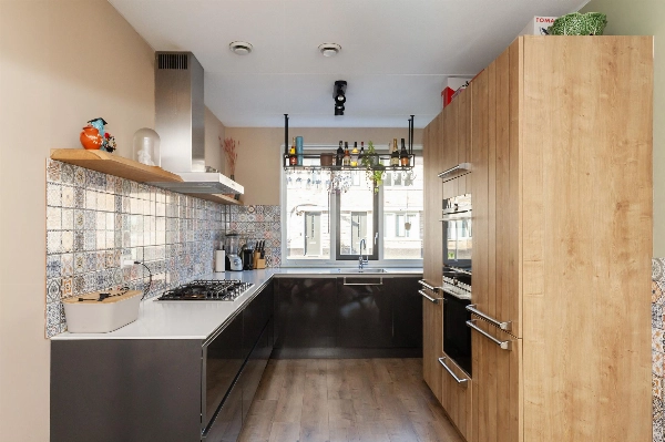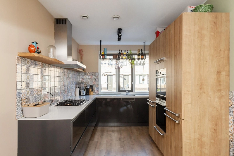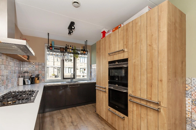 Aan de voorzijde bevindt zich de stijlvolle L-vormige keuken in diep donkerbruin met houtlook, afgewerkt met een wit composiet aanrechtblad. De keuken is van alle gemakken voorzien: een 5 pits Kitchen Aid gaskookplaat, een RVS afzuigkap en een vaatwasser. In het hoge kastengedeelte bevinden zich een koelkast, een vriezer, een oven en een combi-oven.
