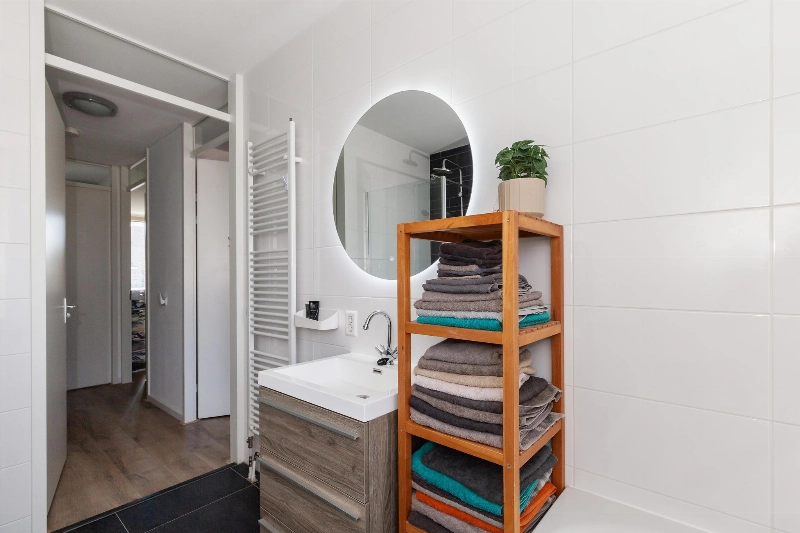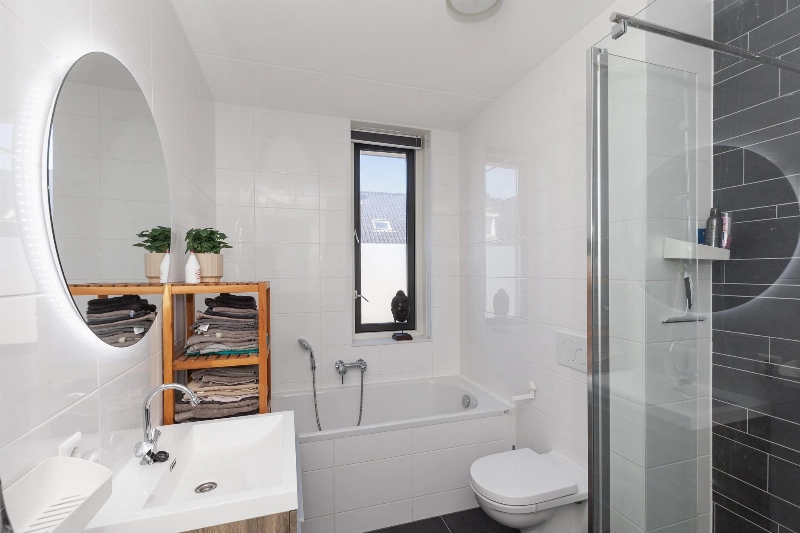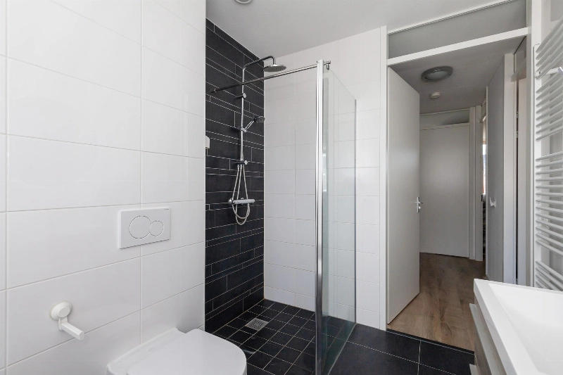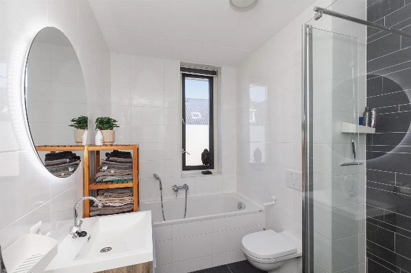 De badkamer is stijlvol uitgevoerd in dezelfde kleuren als het toilet en beschikt over een douchehoek met glazen wand, een ligbad, een zwevend toilet, een handdoekradiator en een wastafelmeubel met lades.